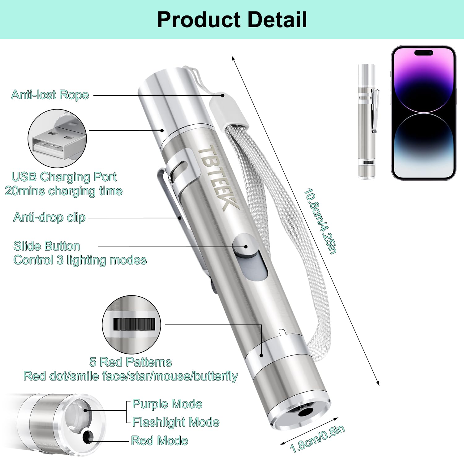 • 7 in 1 Modes: Scroll the gear to pick 5 red patterns(dots, smiles, mouse, stars, butterflies). The variety of patterns sparks pet's interest, enhancing your and cats' interaction. 3 lighting modes can be adjusted, red for cat playing, purple for checking cat skin health /money, white for mini flashlight
