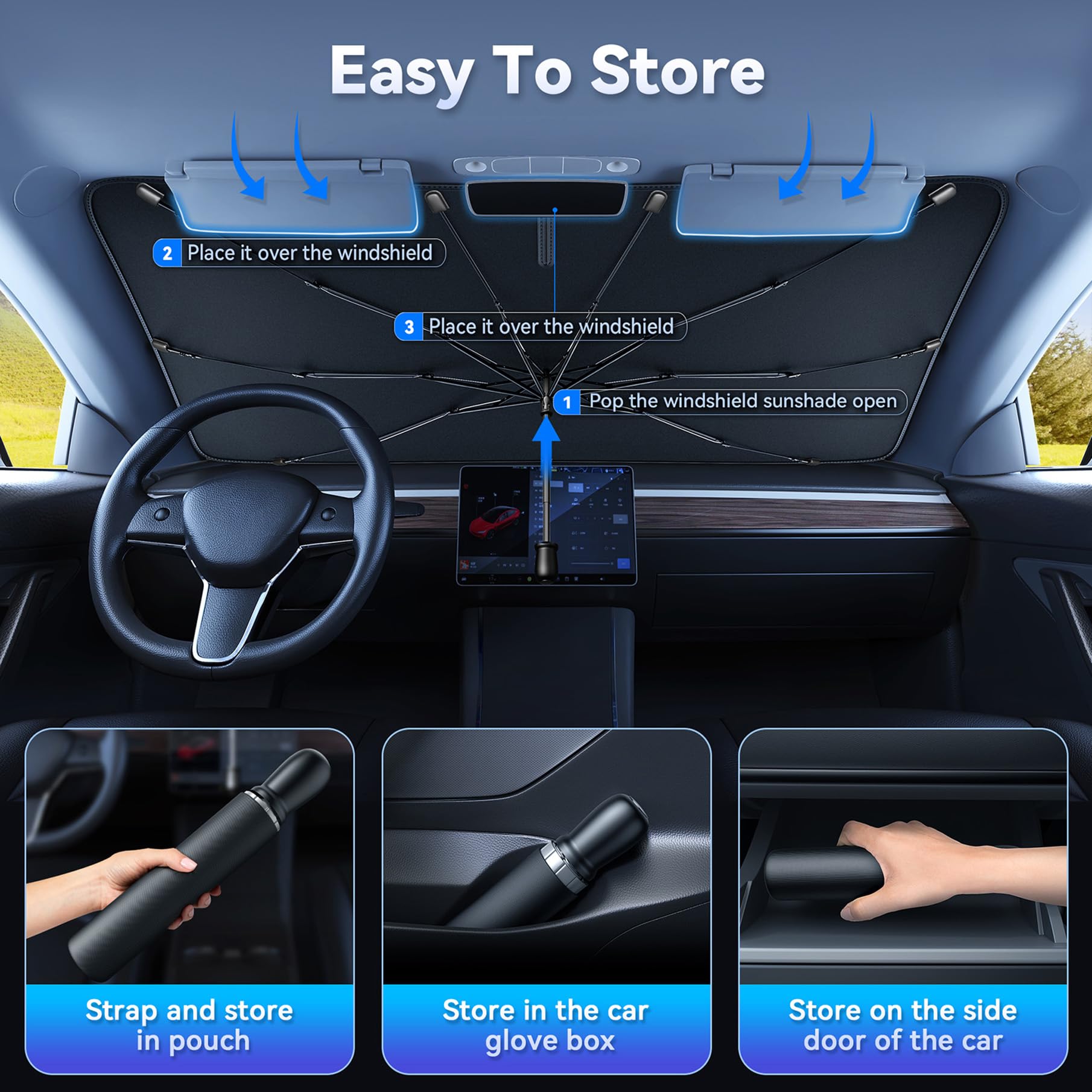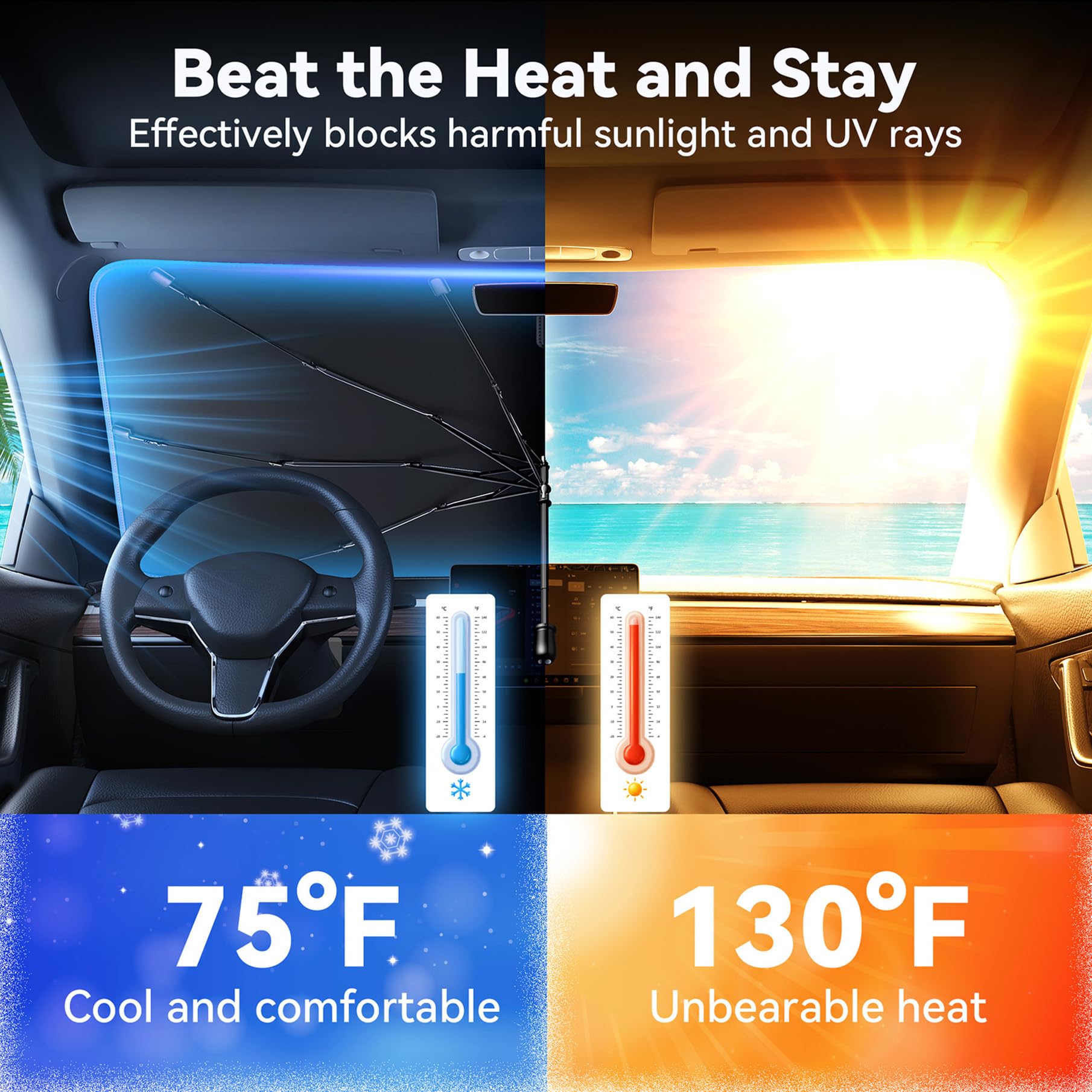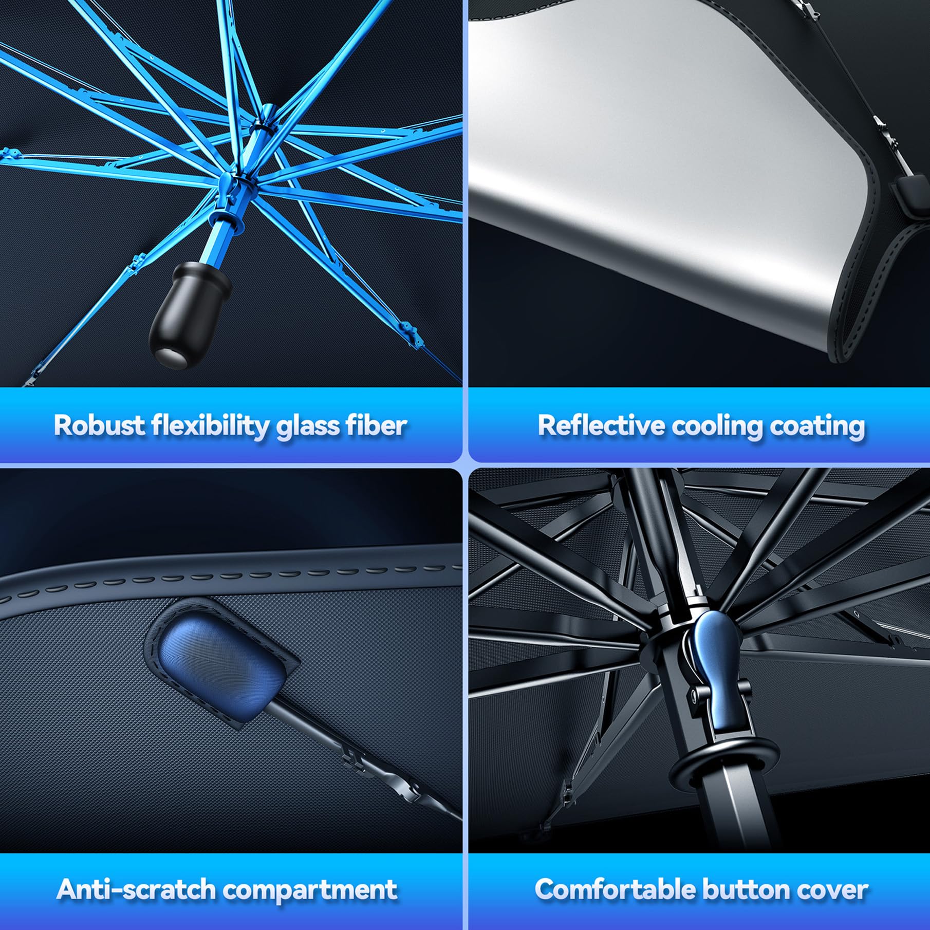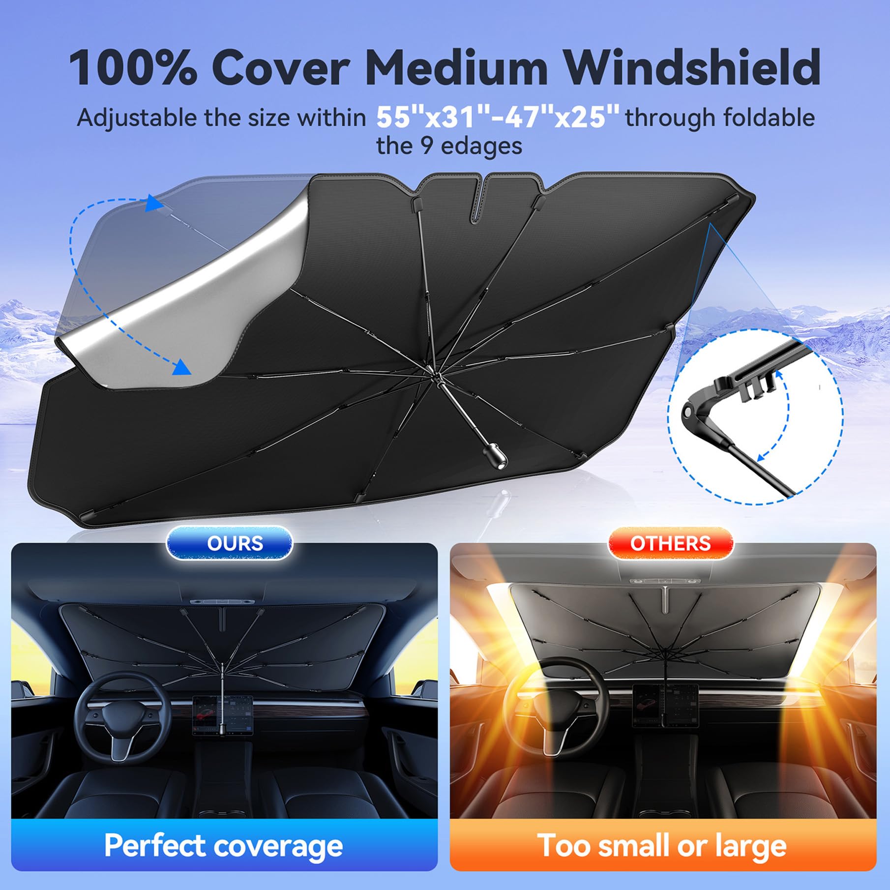 TECKNET Car Windshield Sun Shade Umbrella, Foldable Windshield Sun Shade for Car Block UV Rays and Heat, Adjustable Size (55"x31",47"x25")