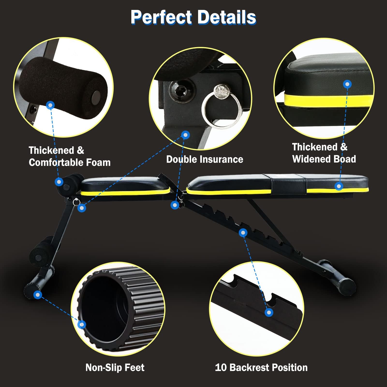 • 【Foldable & Easy to Assemble】 Assembled in 3 minutes. Follow the instructions to tighten the two screws, insert the two safety pins & foam roller. The folded weight bench size: 34 'L x 13 'W x 8 'H, saving 85% of space. Pull out the two safety pins. You can easily store it in a corner, closet or under your bed.