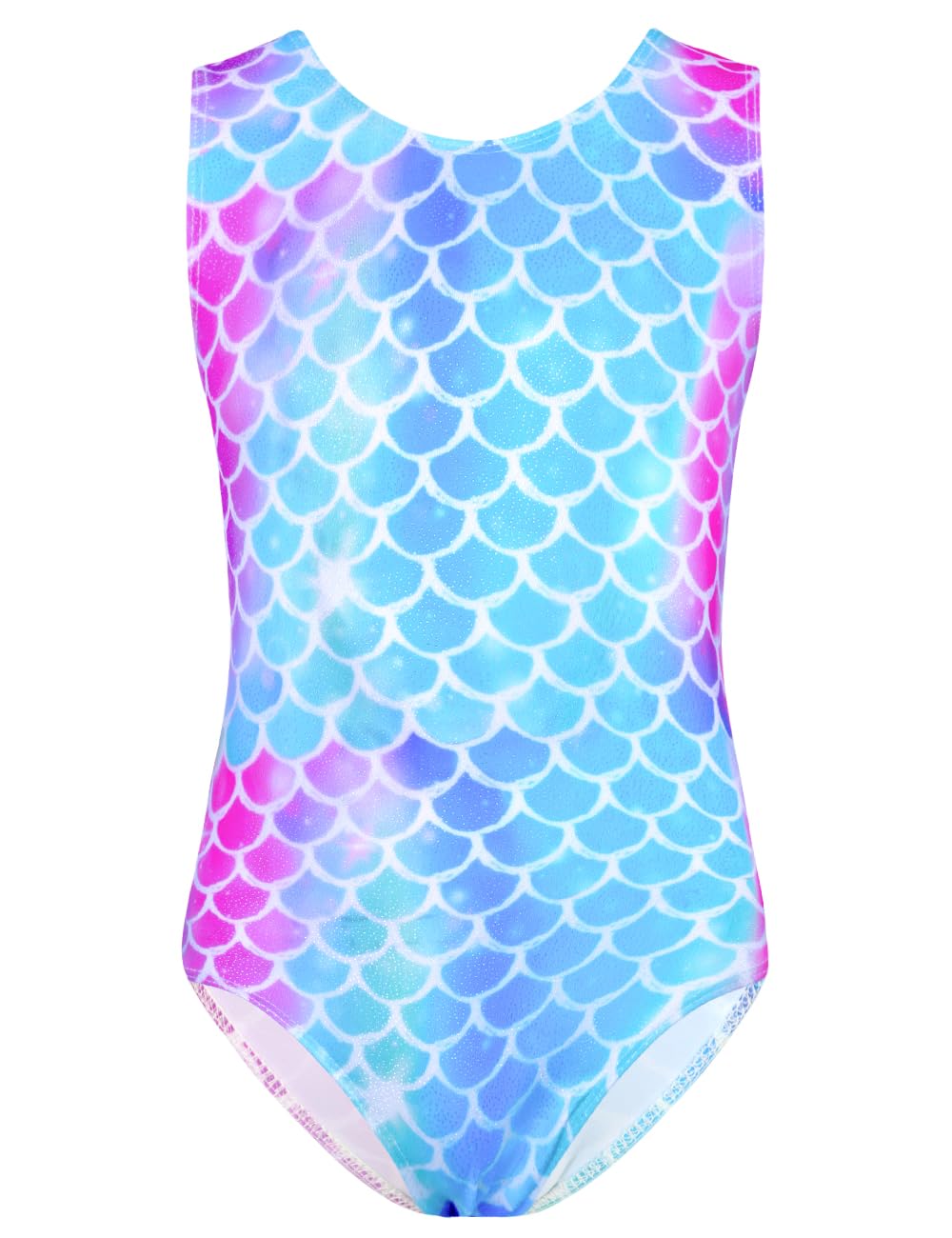 TENVDA Leotards for Girls Gymnastics Tumbling Outfits Size 5-6 Years Old Sparkly Blue Mermaid Scale Printed Sleeveless Cheer Practice Bodysuit