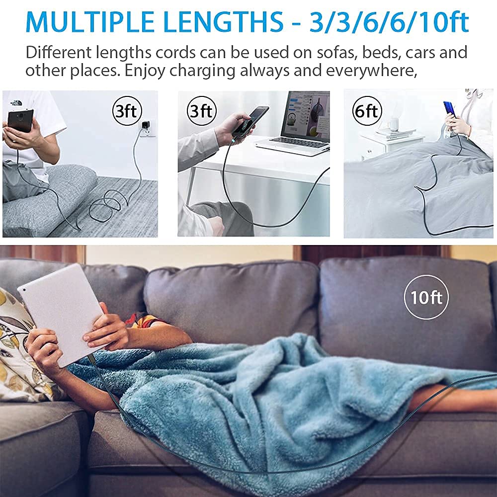 • MULTIPLE LENGTHS - 3/3/6/6/10ft - Different lengths cords can be used on sofas, beds, cars and other places. Enjoy charging always and everywhere, without worrying about taking the cable anywhere.