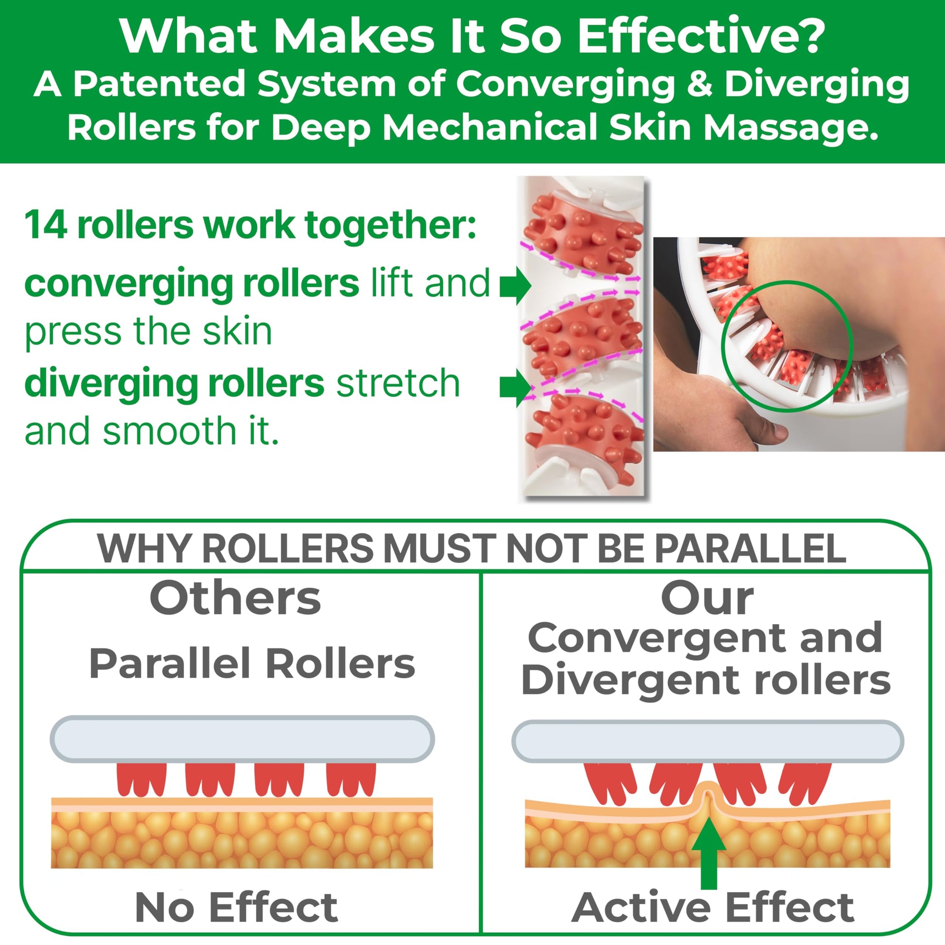 • 🔬 International patented triple-action system: Unlike many look-alike cellulite removers with simple parallel rollers that barely affect the skin, this device features a unique system of converging rollers that lift and firmly squeeze the skin, followed by diverging rollers that stretch and smooth it. If the rollers were parallel, they would have little or no real effect.