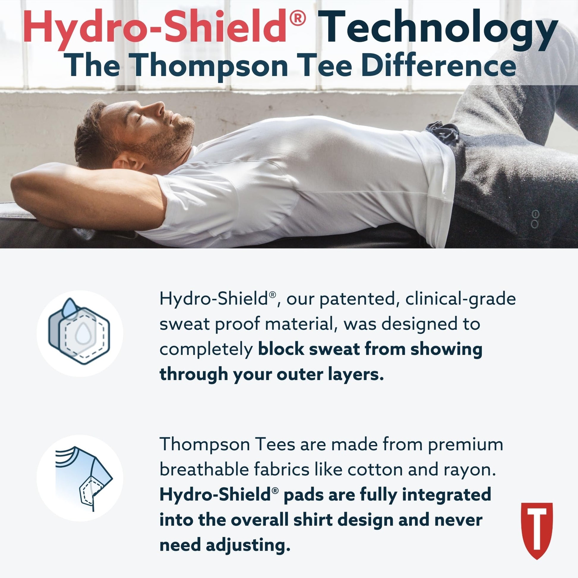 As Seen On Shark Tank! Our shirts have been featured on a number of shows and in various articles including 'Shark Tank' 'The Today Show' 'The Doctor's' 'ABC News' 'Huffington Post' 'SHAPE Magazine' and 'CNBC'! Over the years, we have worked tirelessly to develop the perfect anti-sweat undershirt. Thompson Tee Technology: We poured years of hard work (and lots of armpit sweat) into perfecting our sweatproof shirt, the only sweat-proof undershirt to earn a U.S. patent for our Hydro-Shield sweatproof technology. The Thompson Tee with Hydro-Shield Sweatproof Technology blocks 100% of underarm sweat, preventing embarrassing wet marks and yellow stains. Our shirts will protect and extend the life of your dress shirts. The Thompson Tee combines the best features of an undershirt with our newly designed fully integrated underarm pads to form our proprietary sweat-proof technology and guarantee peace of mind in any situation! About Thompson Tee: At Thompson Tee, we provide freedom, comfort, and confidence to customers in more than 135 countries! We are committed to delivering products that are made in the USA and do not harm the Earth. The fully integrated underarm sweat pads provide a sleek and consistent look and feel. Every Thompson Tee sweat proof undershirt comes with a Sweat Proof Guarantee. We guarantee your underarm sweat will not penetrate our underarm sweat pads! We accept returns on all opened or used sweat proof shirts for up to 30 days from purchase, risk free. 250,000+ satisfied customers from over 135 countries around the world are enjoying our patented sweat proof undershirts with our newly designed integrated underarm sweat pads!