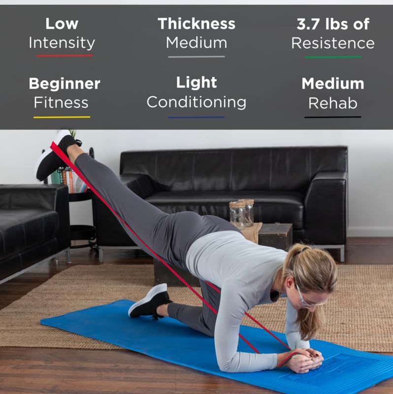 • Each band measures 5 Foot long X 5 Inch wide and comes in three color-coded resistance levels: Yellow-3-4.3 lbs.; Red-3.7-5.5 lbs.; Green-4.6-6.7 lbs.