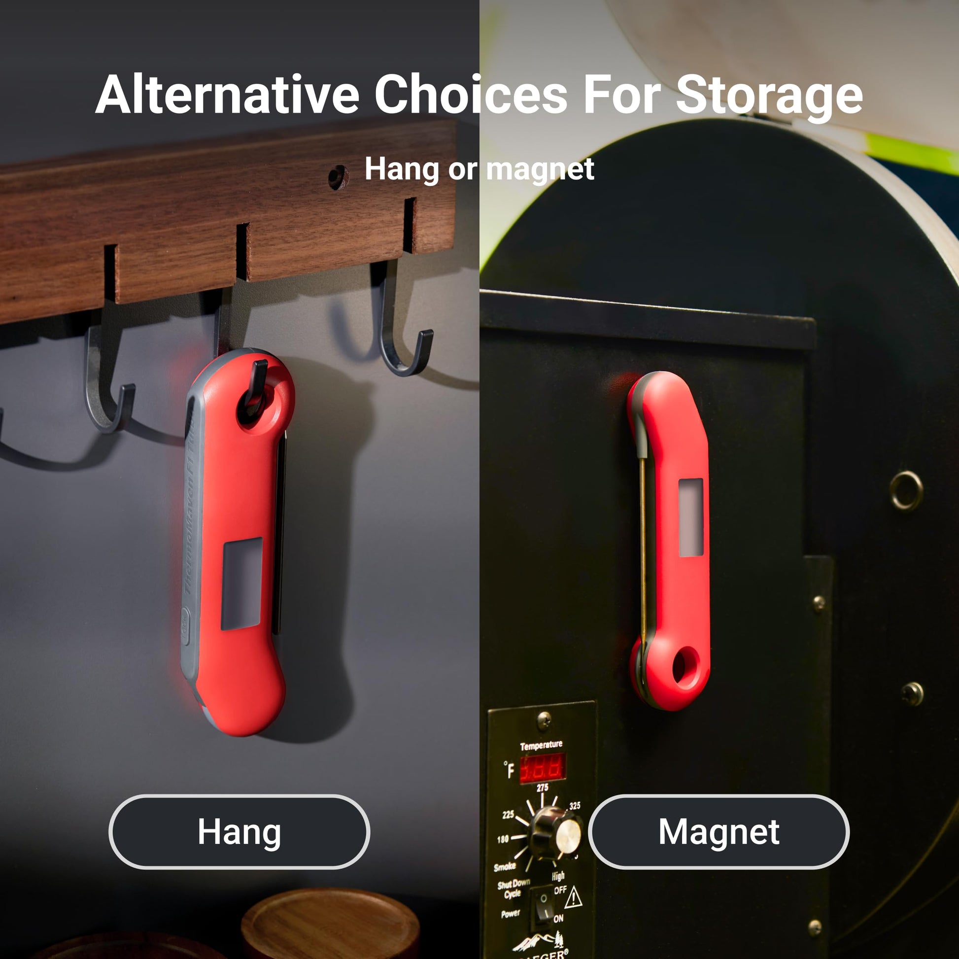 • Versatile Storage: Featuring both hook and magnet designs, ThermoMaven food thermometer for grill offers versatility in storage, accommodating your preferences.