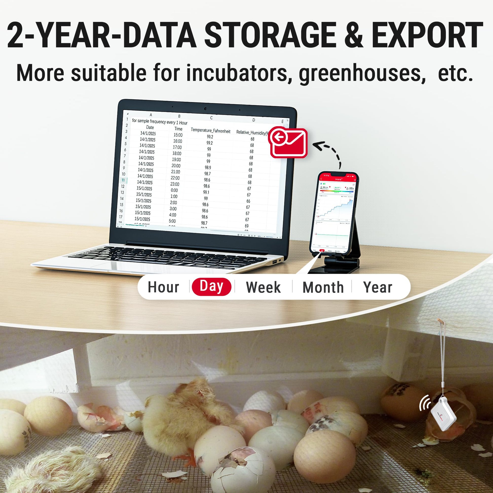 • 【2-Year Data Logging & Export】Store up to 2 years of data and easily export it for analysis, our greenhouse accessories temperature gauge is ideal for incubators, greenhouses, and other applications requiring long-term environmental monitoring