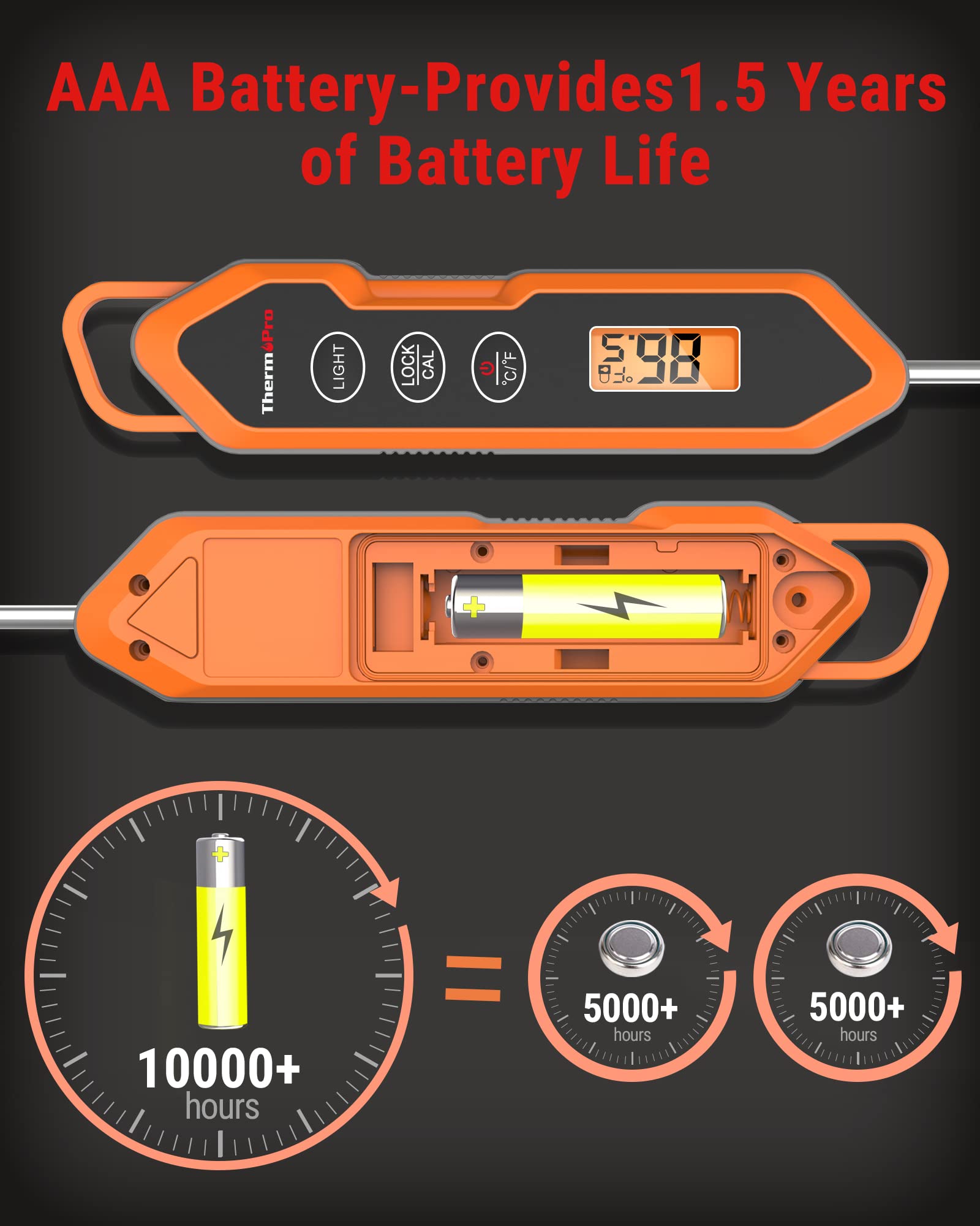 • Backlit, Crystal-Clear LCD Display: BBQ thermometer for grill has a backlight to allow viewing of temps even at night. AAA battery uses battery-saving technology to provide 3,000 hours of battery life