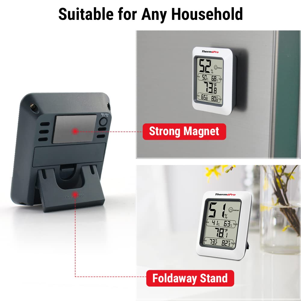 • Healthier Home & Environment: This thermometer hygrometer with temperature and humidity monitor ensures proper indoor humidity that achieves important health benefits for skin and allergen; Can also serve as a refrigerator thermometer, freezer thermometer, reptile thermometer, soil thermometer, humidor hygrometer, cigar hygrometer, and more