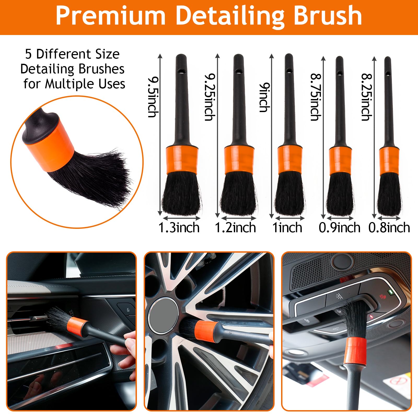 • VARIOUS SIZE DETAIL BRUSH: 5 Different sizes of premium detail brushes, to ensure that can meet your needs, easily explore narrow spaces and while ensure that your car will not be hurt, great for wet and dry use, make your loved car fully tidy and clean from the inside out.