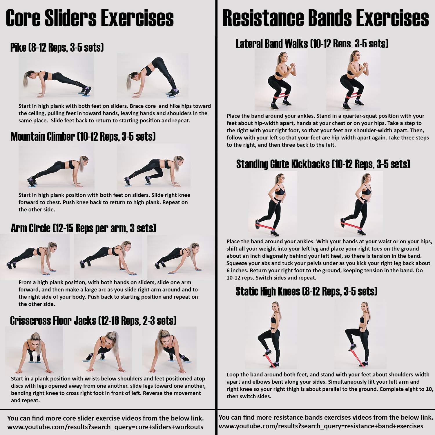 • Bundle [5 Resistance Bands and Core Slider] –5 resistance bands (12' x 2') are made with 100% natural latex (Odor-free & Eco-Friendly). Dual core sliders (7' in diameter) are made with one side fabric, other side plastic. They glide on hardwood or tiled floors (Fabric Side), and also on carpet (Plastic Side).