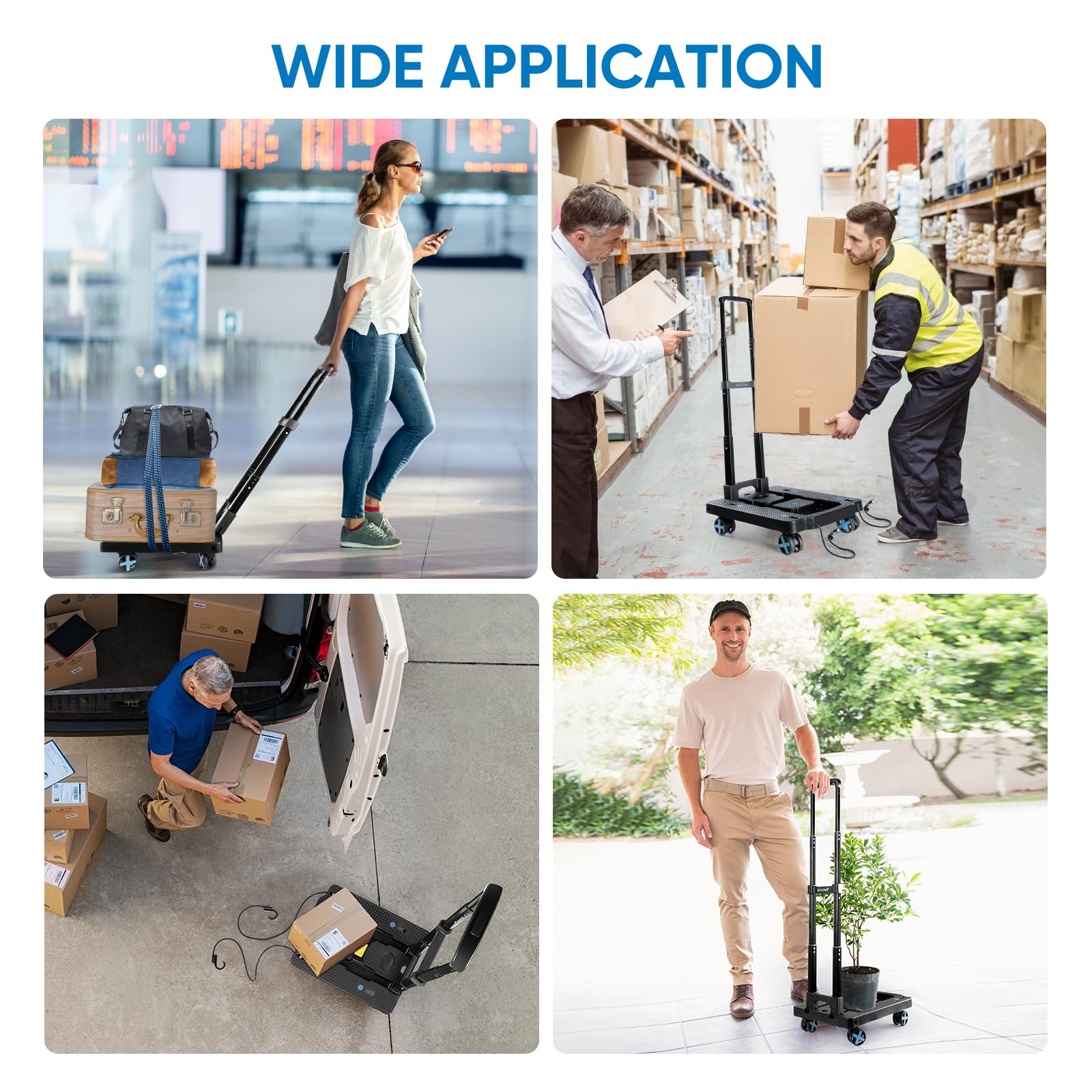 • [LIGHTWEIGHT AND PORTABLE] This luggage cart folds up to 12.4' x 15.75' x 4.13' and weighs only 4.4 pounds, making it very easy to carry and store. It can be easily unfolded and folded, ideal for moving, shopping, loading and unloading goods, transporting luggage, warehouse work, gardening and more.