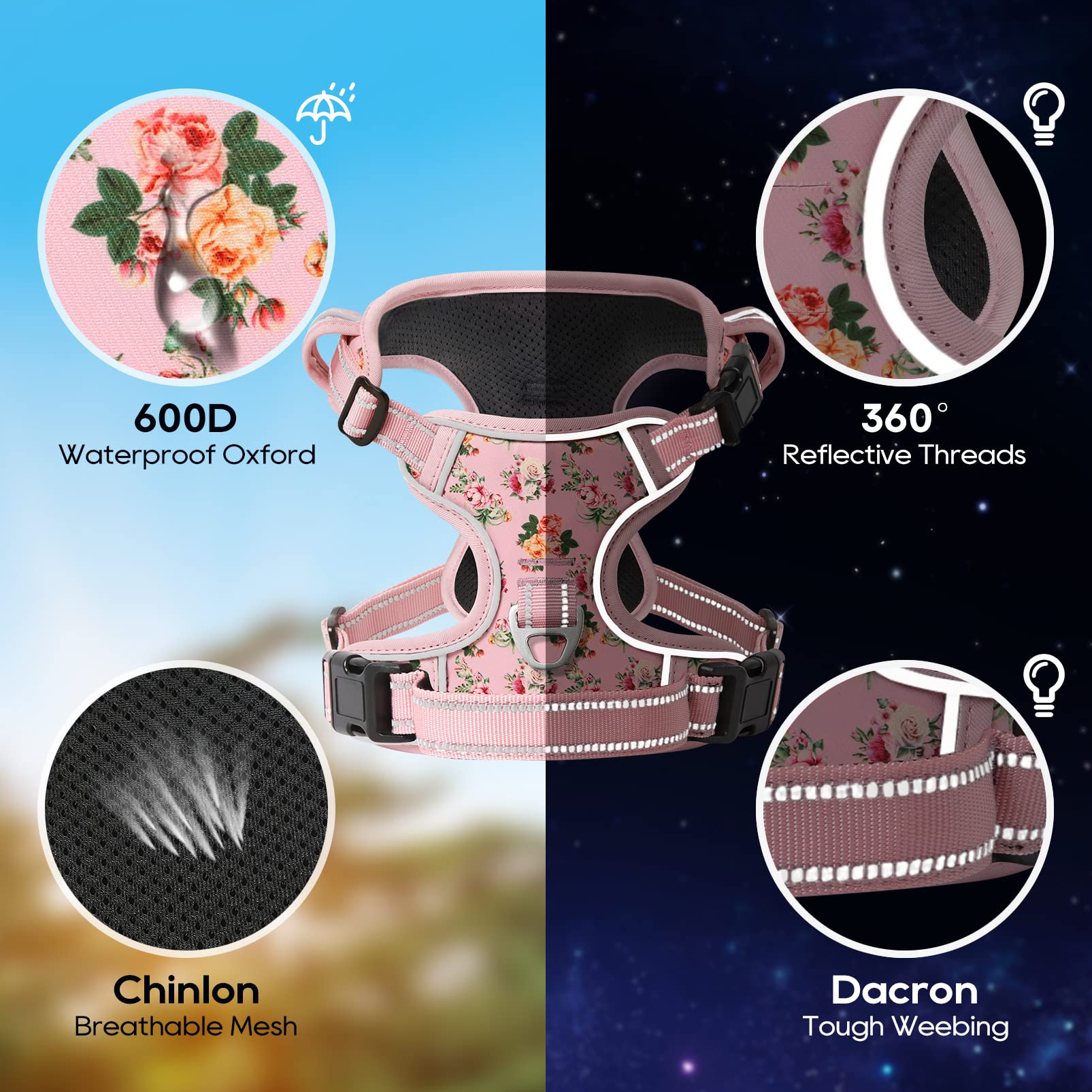Timos No Pull Dog Harness,NO Need Go Over Dogs Head 3 Snap Buckles Reflective Oxford No Choke Harness with Front & Back 2 Metal Leash Clips Soft Padded for Small Medium Large Dogs Pink S