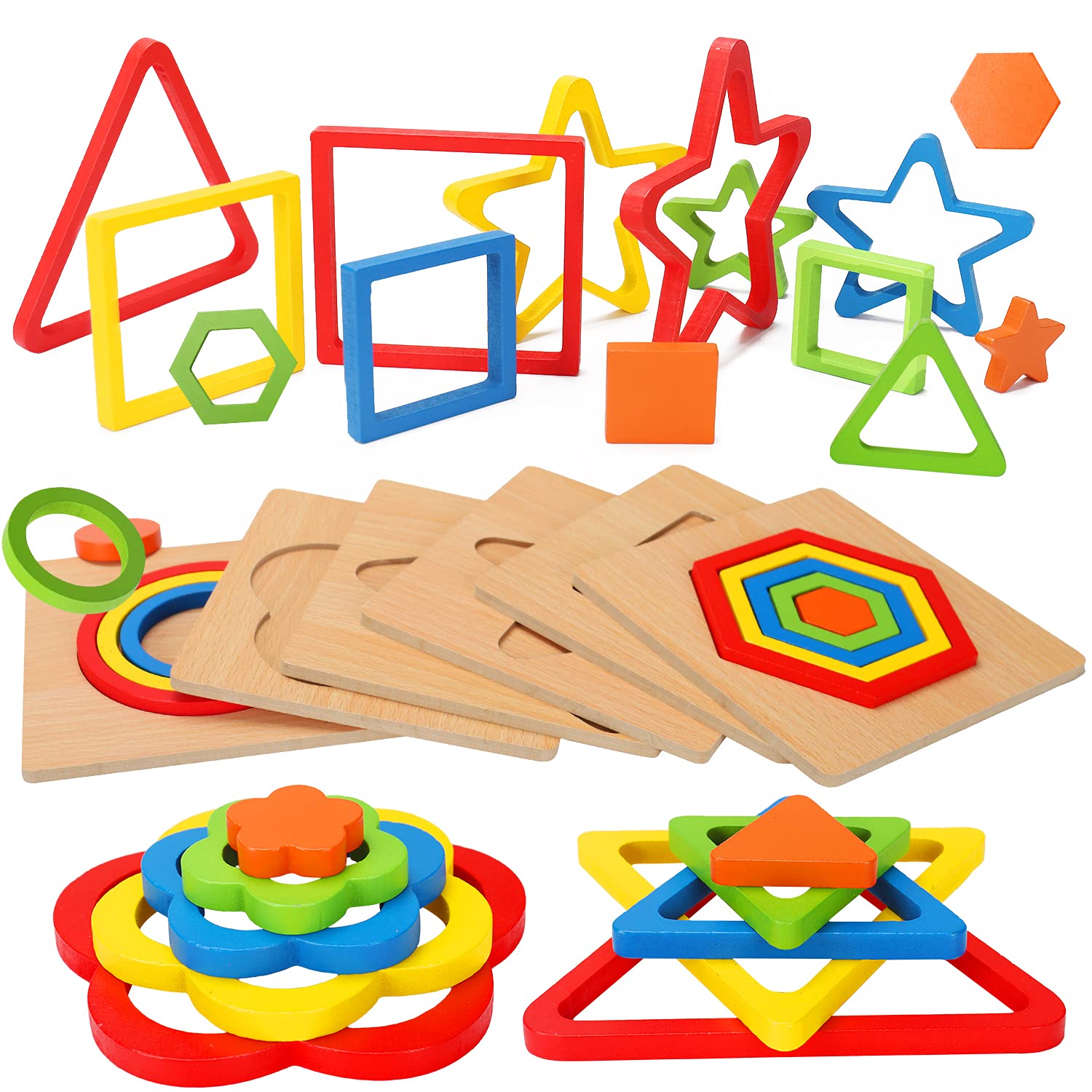 • ✿ Toddler Puzzles:The wooden toys include flower, square, circle, triangle, star and hexagon puzzles, each shape blocks coming with a board. Great cause and effect toys for kids to identify different shape puzzles, colors and sizes of the puzzle blocks, great toddler block Montessori toys for 2 year old. Easter gift for toddlers.