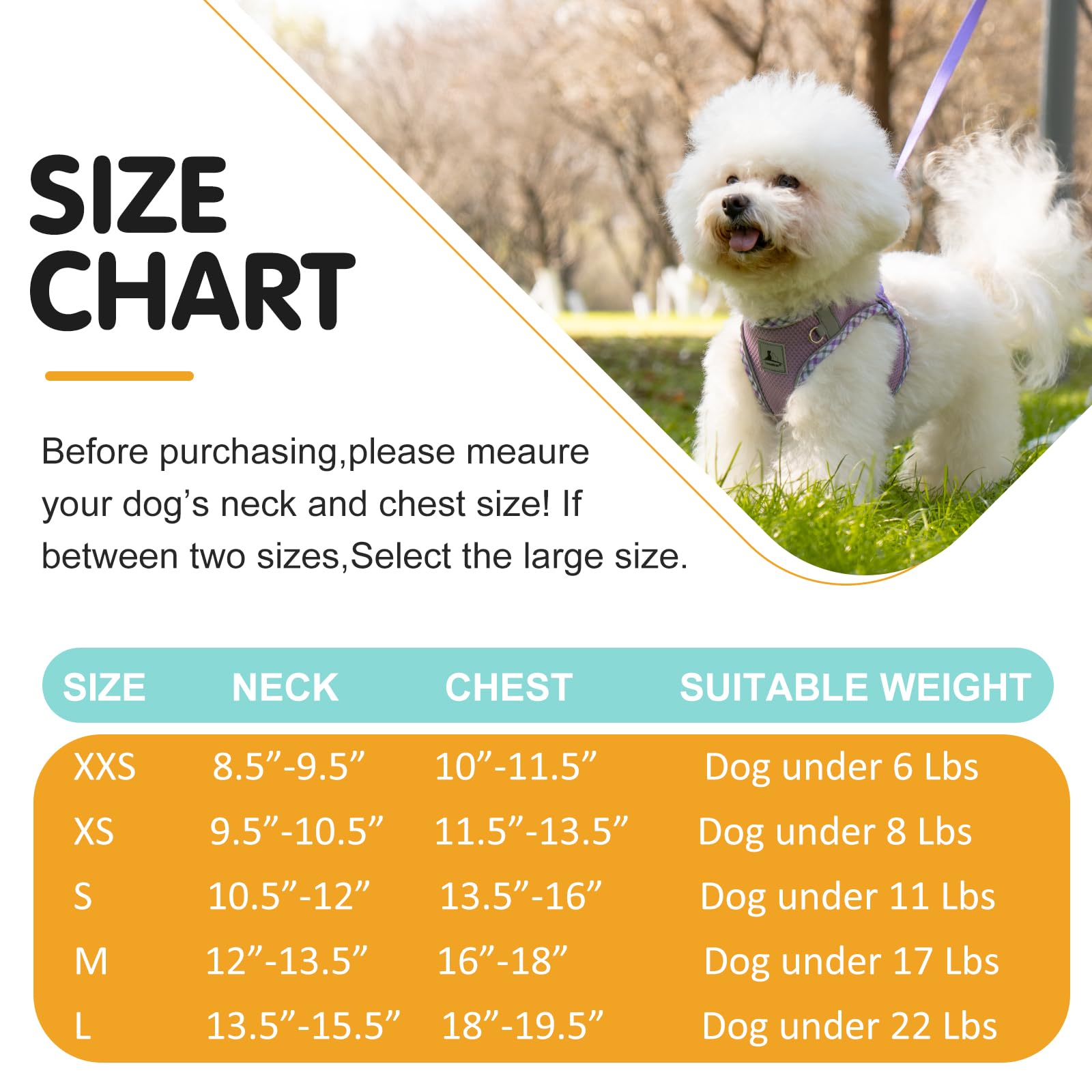 • Measure Before Ordering; This harness is designed for small dogs only. Size 'Large' is NOT mean it is suitable for large dogs! It's just the maximum size of this harness! Besides, different brands have different size data, so with each purchase, please check the size chart information carefully. If in between sizes, please order NEXT SIZE, which has room for growth.