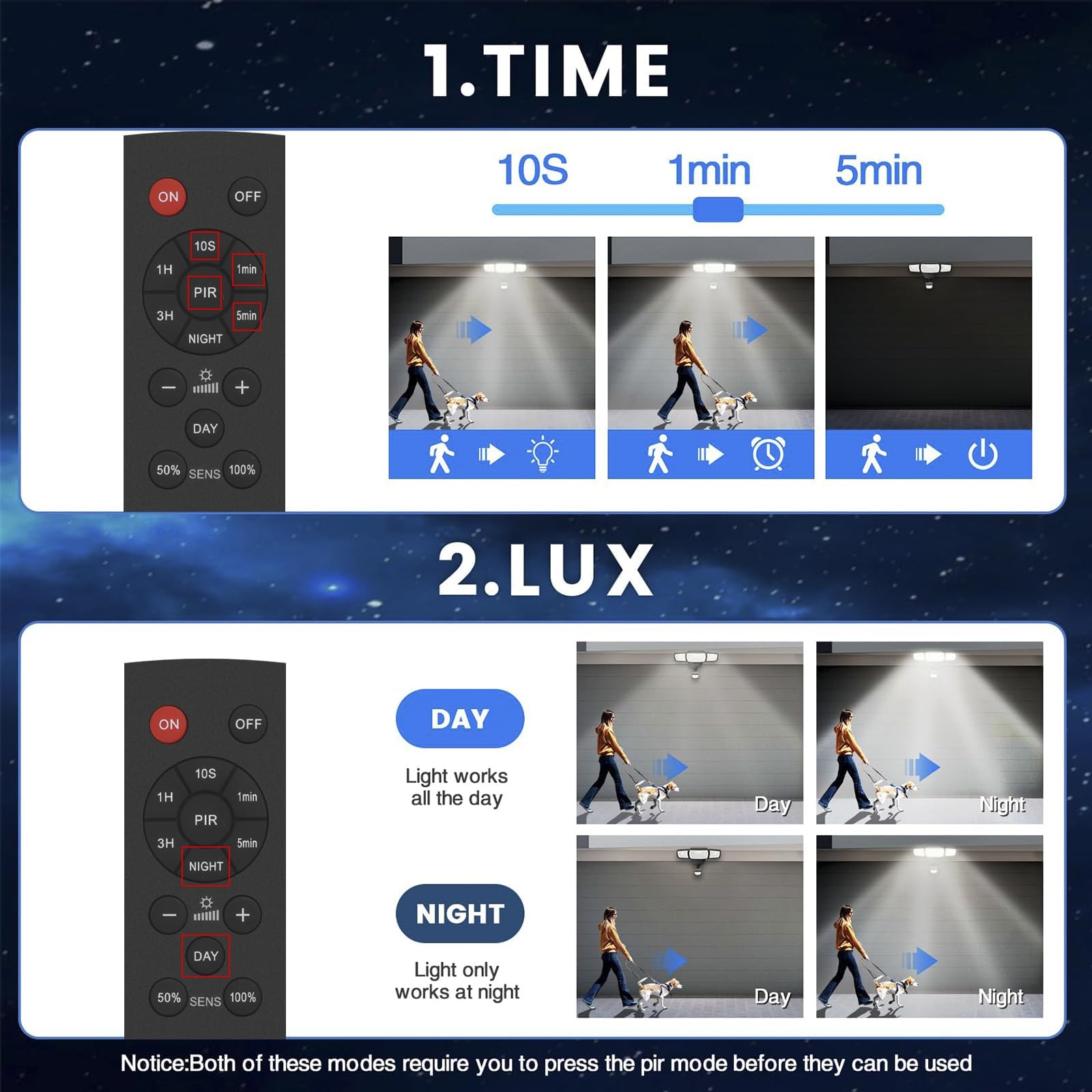 • 3 Modes & Timer: Dusk to dawn mode, motion sensor mode, and always-on mode are available. You can freely switch modes with remote control to meet your diverse needs. always-on mode has a timer function, you can set the daily duration, customize the lighting time according to your needs. the automatic light off time can be adjusted.The sensing distance is 4-12 meters, and the sensing angle is 180 °.