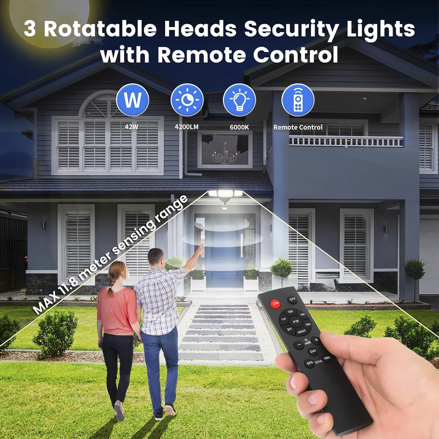TONGLIN Security Light Outdoor, 4200LM 75LED Wiring Motion Sensor Lights, 42W 3-Head Angel Adjustable Flood Light with Remote Control, IP66 Waterproof Garden Light for Porch Patio Driveway Pathway