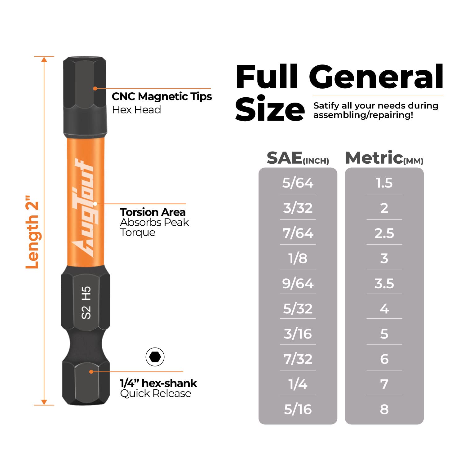 toolant Impact Hex Head Allen Wrench Drill Bit Set 20pcs (Metric&SAE), 1/4” Hex-Shank S2 Steel Hex Bits Set, CNC Machined Tips with Magnetism, 2” Long with Storage Box