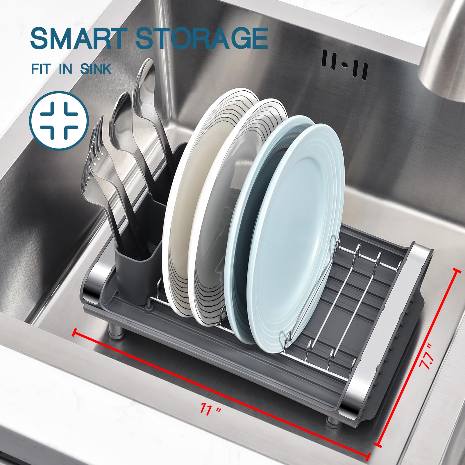 TOOLF Expandable Dish Rack, Compact Dish Drainer, Stainless Steel Dish Drying Rack with Removable Cutlery Holder, Anti Rust Plate Rack, Small Sink Drainer for Sink or Kitchen Countertop