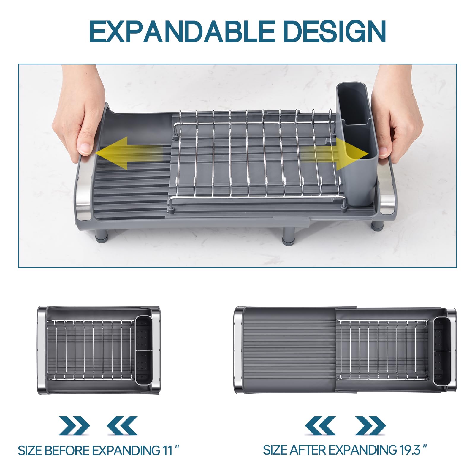 • [ EXTENDABLE DESIGN ] This dish rack is extendable to hold more items, and fold up to save space. It's suitable for different kitchen countertop surface. Dimensions:11'-19.3'L×7.7'W×3.54'H. When not in use, it can be folded up for convenient storage in a drawer