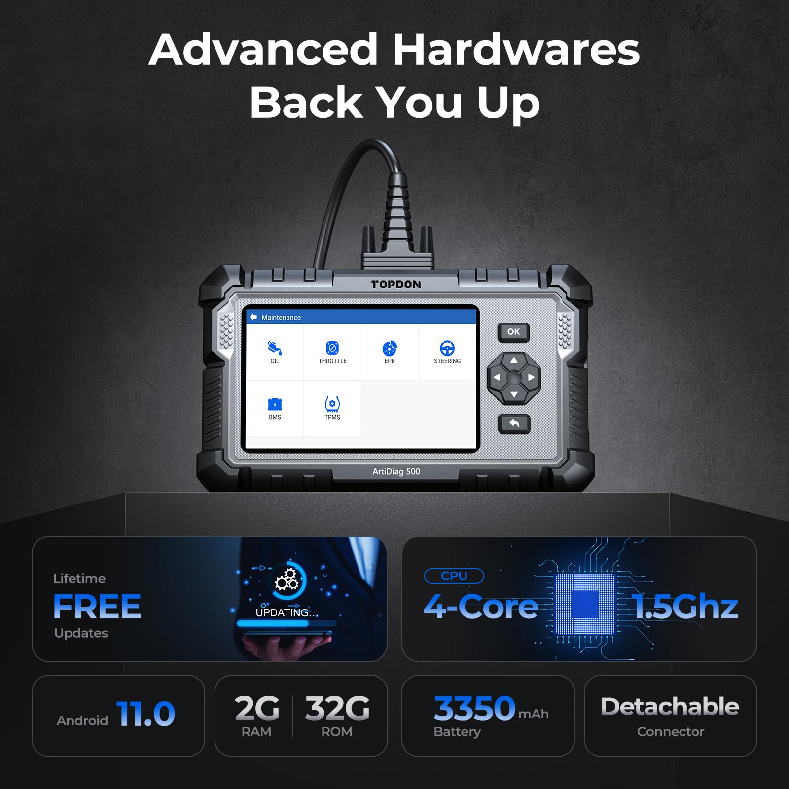 • 【Upgraded ArtiDiag500 for Peak Performance】Experience enhanced performance with the upgraded AD500 diagnostic tool, boasting a 4-core 1.5GHz CPU, 2GB RAM + 32GB ROM, and seamless operation with Android 11.0. Enjoy extended battery life with its 3350mAh capacity. Plus, benefit from TOPDON's 1-year quality backup for added peace of mind.