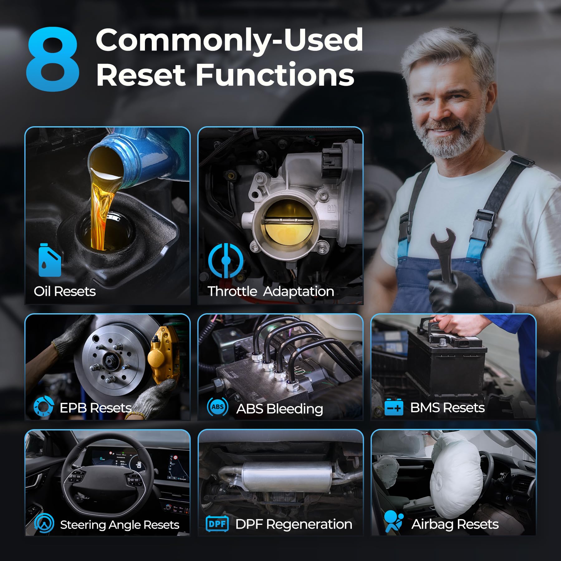 • [8 HOT Reset Services]: The TOPDON scanner for car supports 8 of the most popular services, including Oil Resets, Throttle Adaptation, EPB Resets, Steering Angle Resets, DPF Regeneration, ABS Bleeding, BMS Resets, Airbag Resets, and the list is still growing. Offers daily service and maintenance to 99% global cars.