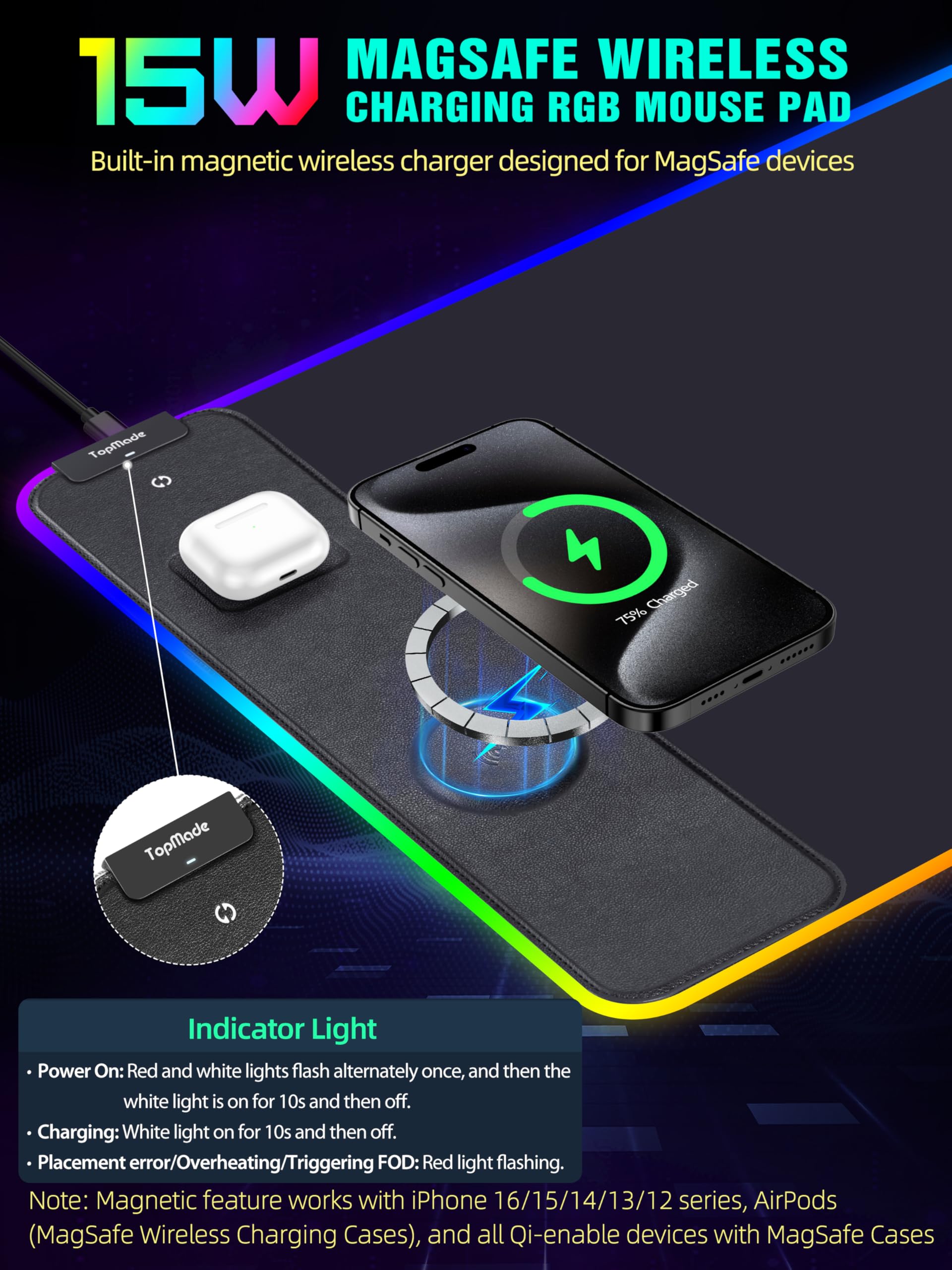 • 【Extra Large 4-IN-1 Wireless Charging Mouse Pad for Desk】 TopMade New Extended RGB Mousepad is 31.5' x 15.75', the extra large usable area covers your desk keyboard, mouse, and other items while gaming or working, and combines 3 functions of phone charging, AirPods charging, RGB light and mouse pad in one, allowing you to charge your iPhone and AirPods while using the gaming mousepad without the need for additional cables interfering with your desk, keeping your desk neat and tidy