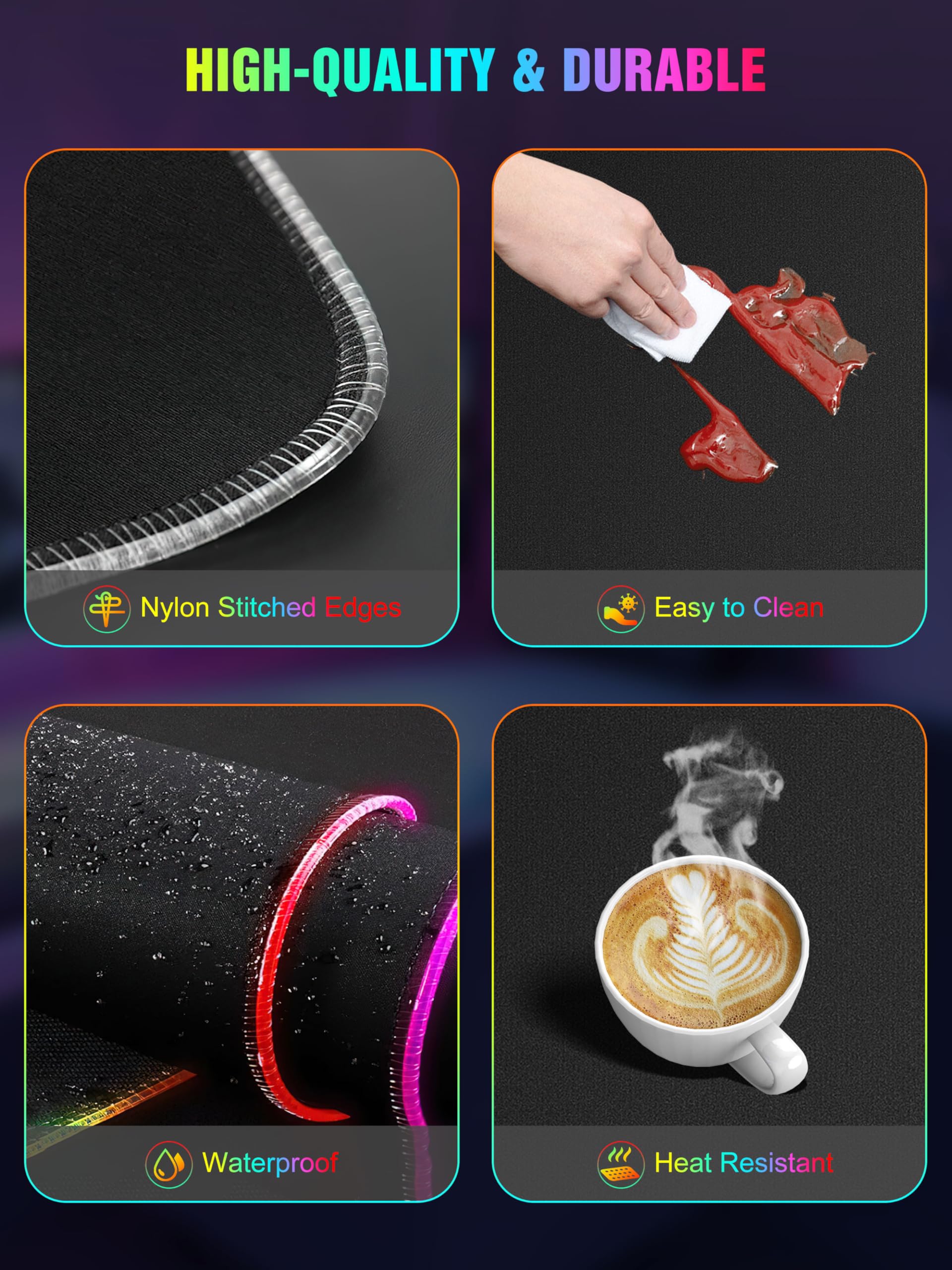 • 【One-Touch Control for 4 Light Modes & 11 RGB Colors】 This RGB gaming mouse pad has 11 lighting colors and 4 cool lighting modes: Single Color Static, Single Color Breathing, Rainbow, and Faster Rainbow Mode. One-button control makes it easy to quickly select your favorite lighting mode. Long press the RGB light mode option key to control the light on/off; click the option key to switch between the 11 light colors; and a quick double-click the option key to switch between 4 lighting modes