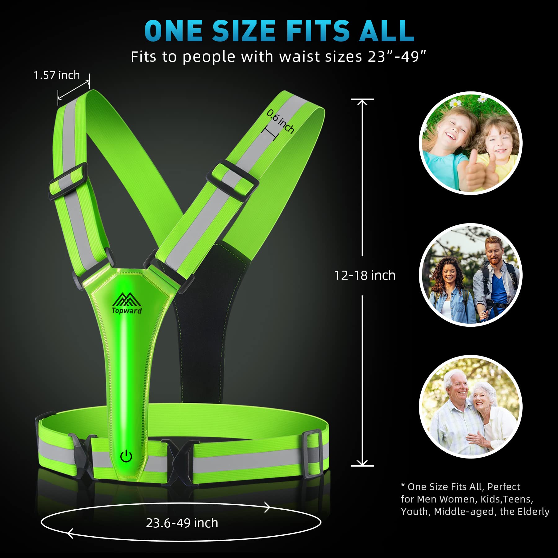 • COMFORTABLE & ELASTIC & ADJUSTABLE - The ergonomic design of this LED reflective vest ensures your comfort when you wear it over any dress typically t-shirt, sports gear, jacket as per the season. Waist circumference expands from 23' to 49'; Shoulder strap: 12 - 26 inch; perfect gift for men/women/kids/teens/the elderly