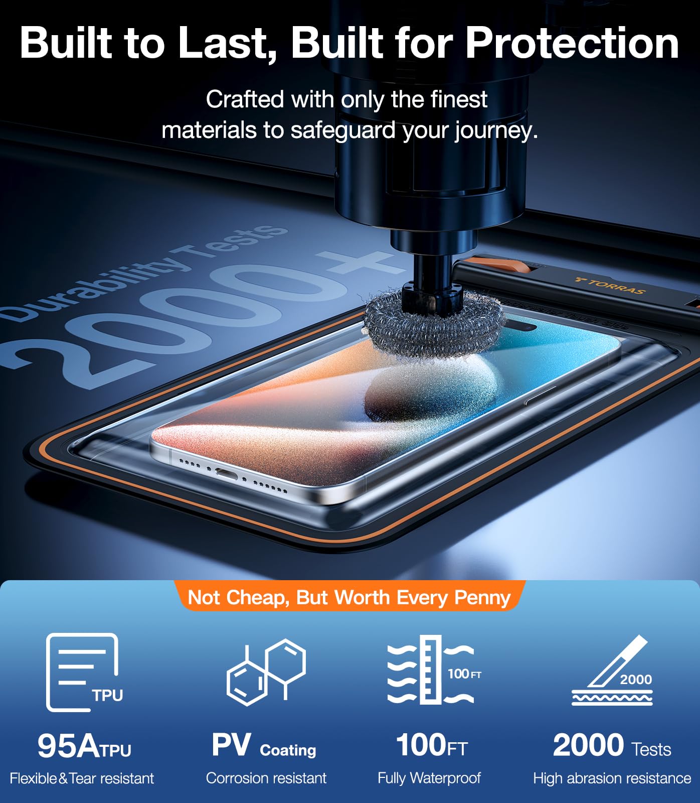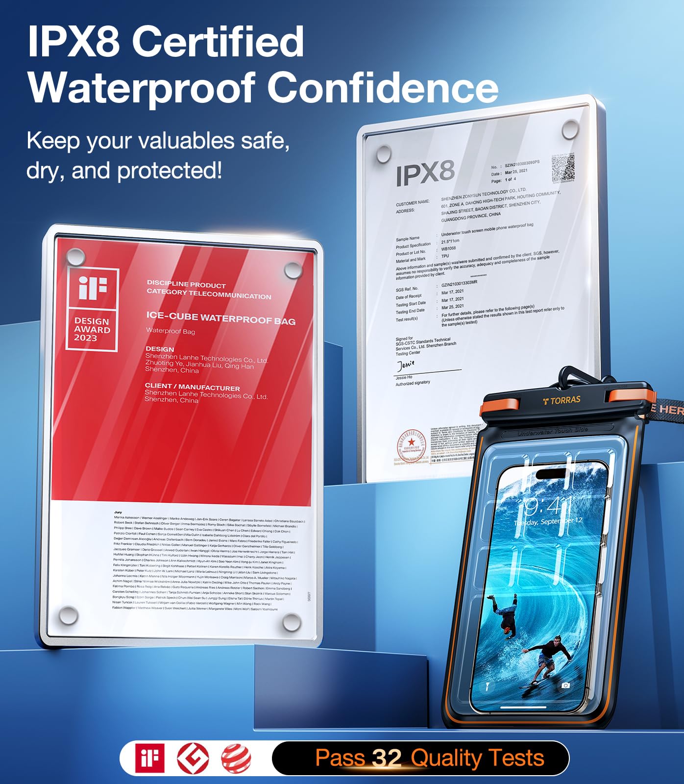 • SUPERIOR WATERPROOF PERFORMANCE: In 2025, TORRAS waterproof phone pouch underwent an overall upgrade and reached the highest standard! We use the latest Shield Technology to prevent water penetration; upgraded to high-quality 95A TPU, which maintains flexibility while enhancing abrasion resistance and transparency; the precision ABS close clasp to ensure zero leaks! Plus, with a comprehensive testing system and a 365-day quality guarantee, allowing you dive into summer fun worry-free!