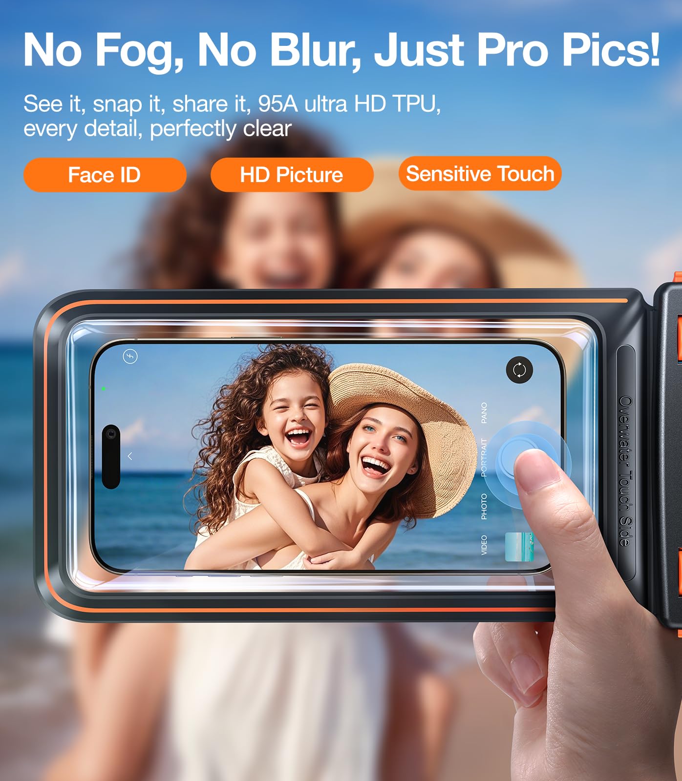• CLEAR PHOTOGRAPHY, SENSITIVE TOUCH: Crafted from high-transparency 95A TPU material with a dual-sided usable design, ensures clear capture of moments both above and below water. The 'IceCube' side allows you to easily snap photos with dolphins underwater. The overwater side allows you to enjoy crystal-clear screens and a sensitive touch. Easily edit messages, Face ID and Facetime calls without removing your phone from waterproof dry bags