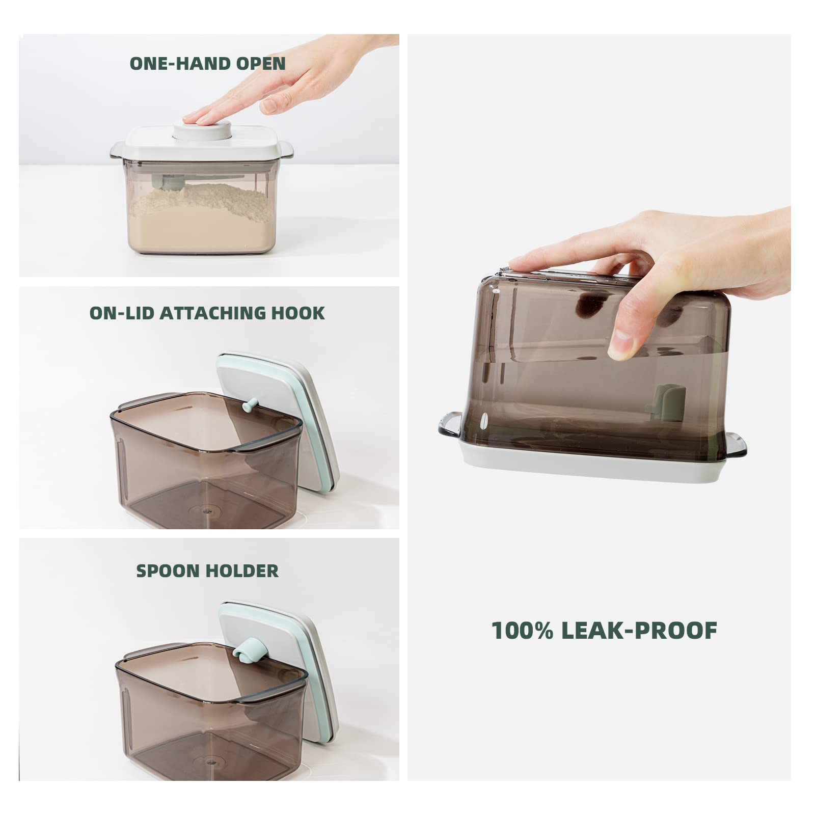 • Our baby formula dispenser on the go has a one-button design that eliminates the hassle of opening and closing. It also features a replaceable spoon holder and a lid-hook, adding to its convenience.