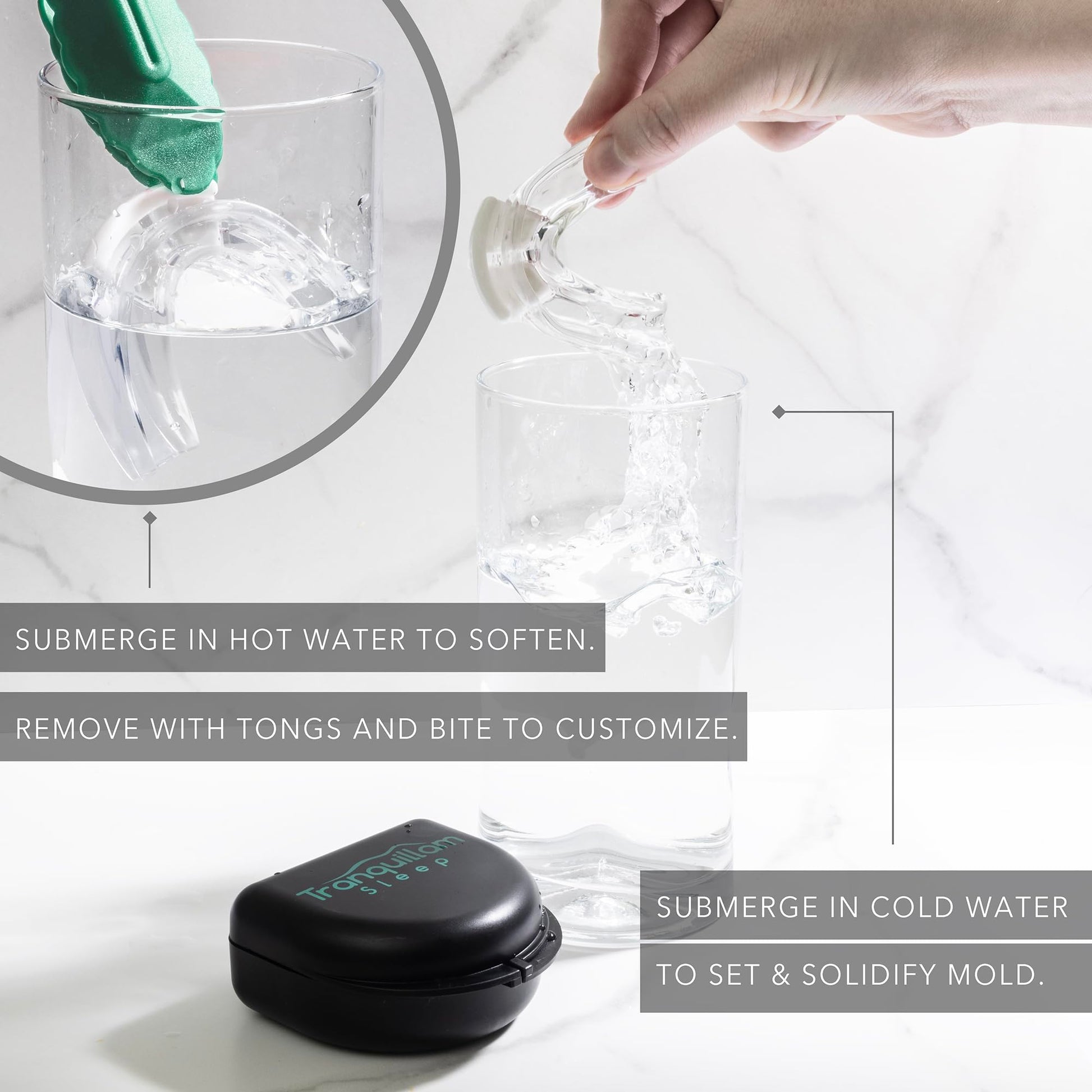 • Easy to use! Our mouthguard is incredibly easy to use! Simply place the product in warm water for a few minutes to allow the plastic time to become moldable. Then place the mouthpiece in your mouth and bite to mold the retainer to form to your teeth! Some mouth pieces have many steps to create the custom fit - We have a 1 step process that will give you relief while you sleep. We promise you will find our product very easy to use!