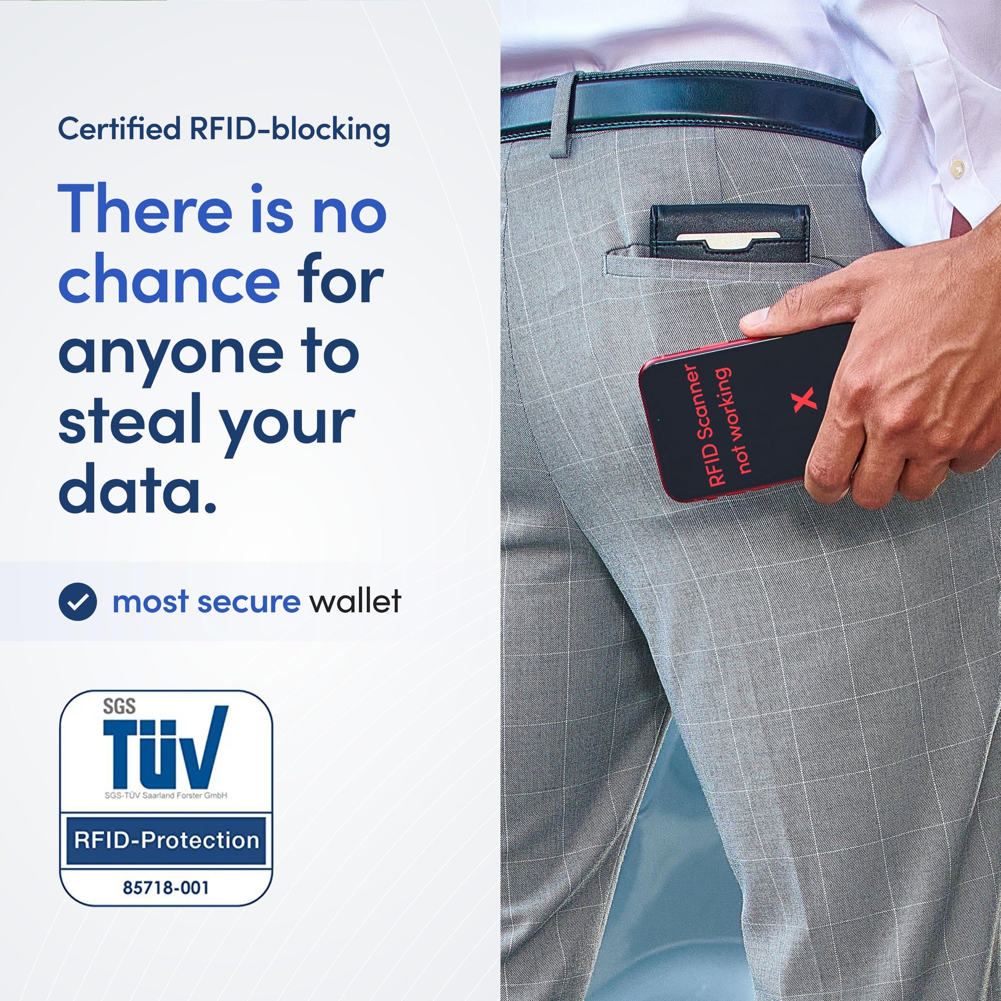 • ๐—œ๐—ก๐——๐—จ๐—ฆ๐—ง๐—ฅ๐—ฌ-๐—ง๐—˜๐—ฆ๐—ง๐—˜๐—— ๐—ฆ๐—˜๐—–๐—จ๐—ฅ๐—œ๐—ง๐—ฌ - Tested by an independent German quality control institute. Our wallets block the 13.56 MHz band and protect against data theft by RFID scanners