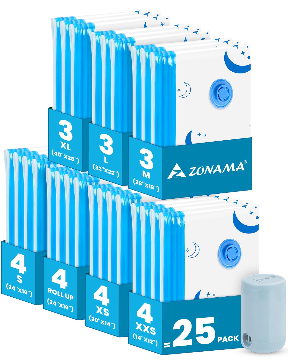• 【25 Pack in 7 Different Size】We provide 25 pack Vacuum Storage Bags in 7 different sizes, 3 Jumbo, 3 Large,3 Medium, 4 Small, 4 Extra Small Carry on Size, 4 Extra Small Pouch Size and 4 Roll Up Bags (without cap), which allows you to safely store a large amount of your different sizes out-of-season clothing or bedding in your closets, drawers or under the bed. And extra small size and roll up bags are great travel companions, Best for travelers or home organizers who want a flexible, all-in-one solution for packing both large and small items
