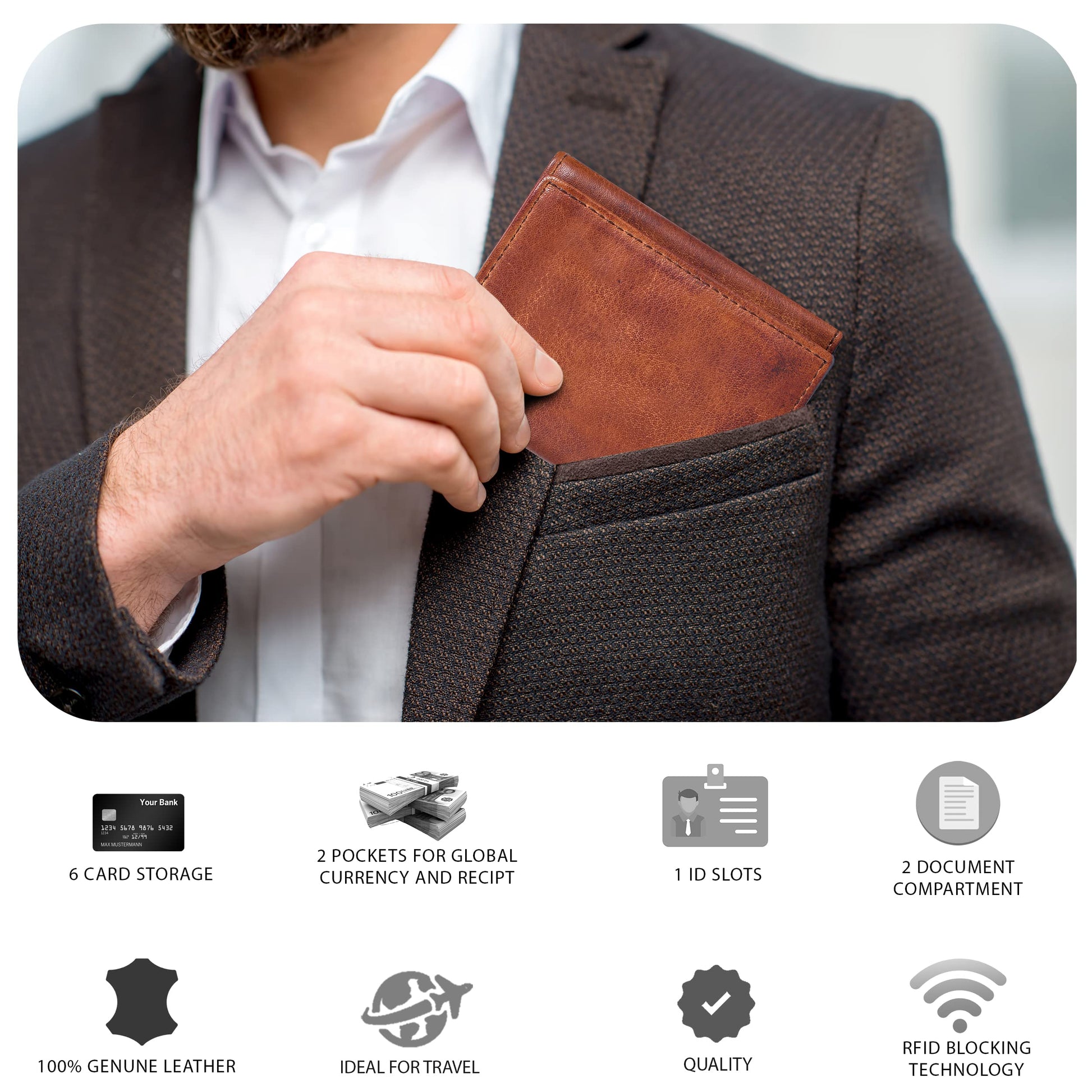 Tri fold Leather Wallet for Men with RFID | Slim Wallets for Men with 1 ID and 6 Credit card slots | Front Pocket Minimalist (Wash Tan)