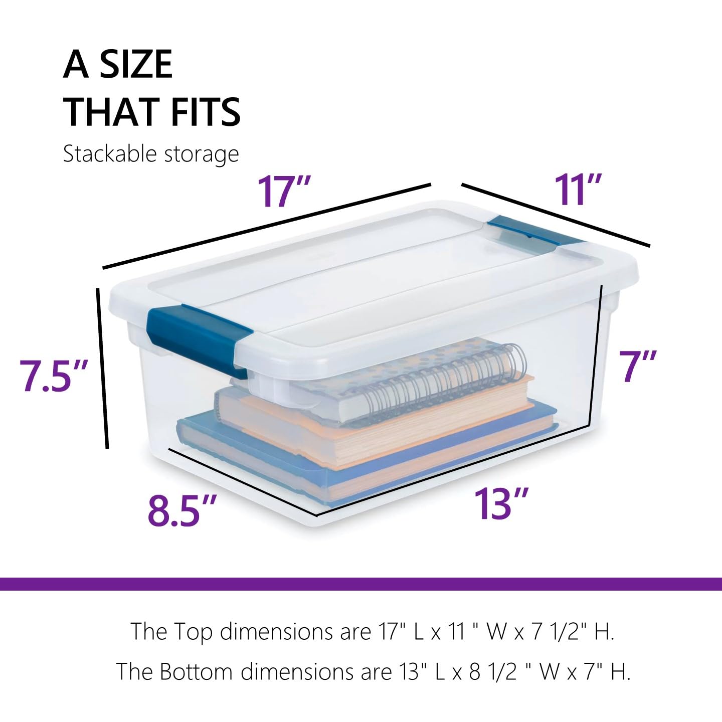 • 15 QT STORAGE CONTAINER WITH LID - The container Dimensions on the outside are 17'L x 11'W x 7.5' H, and the Inside Dimensions are 12.5' L x 8' W x 7' H has sturdy buckle latches that lock the lid securely into place. They won't pop open even when the boxes are accidentally dropped.