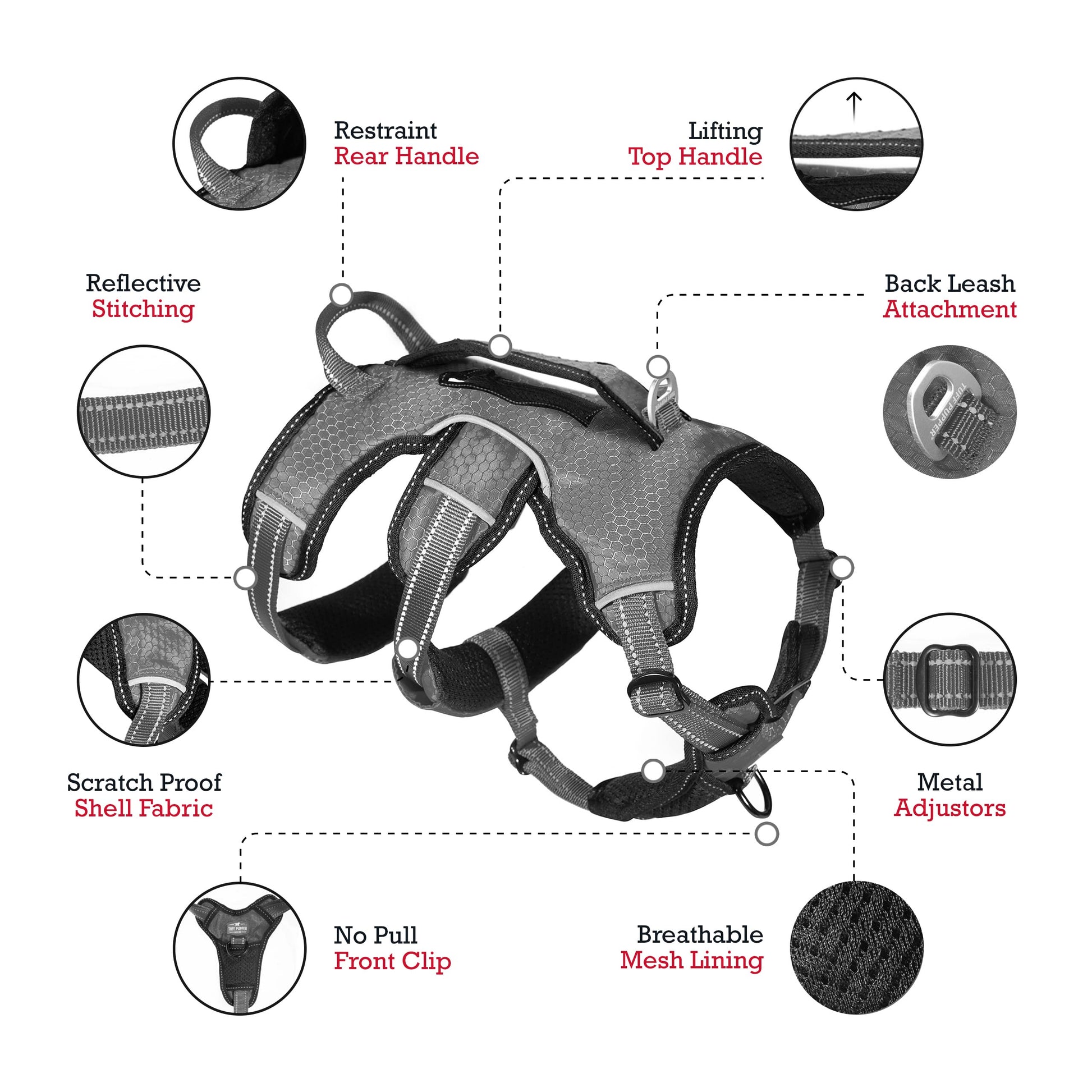 • ENHANCED COMFORT PET HARNESS & DOG LIFT HANDLE – The mesh non escape dog harness padding provides equal load distribution eliminating any wear or hot spots on your dog’s skin. The soft foam material offers maximum breath-ability for vigorous activity during hot summer months. Your dog will love our full body dog harness with handle that provides equal load distribution for safe lifting assistance to rescue, load or unload your dog.