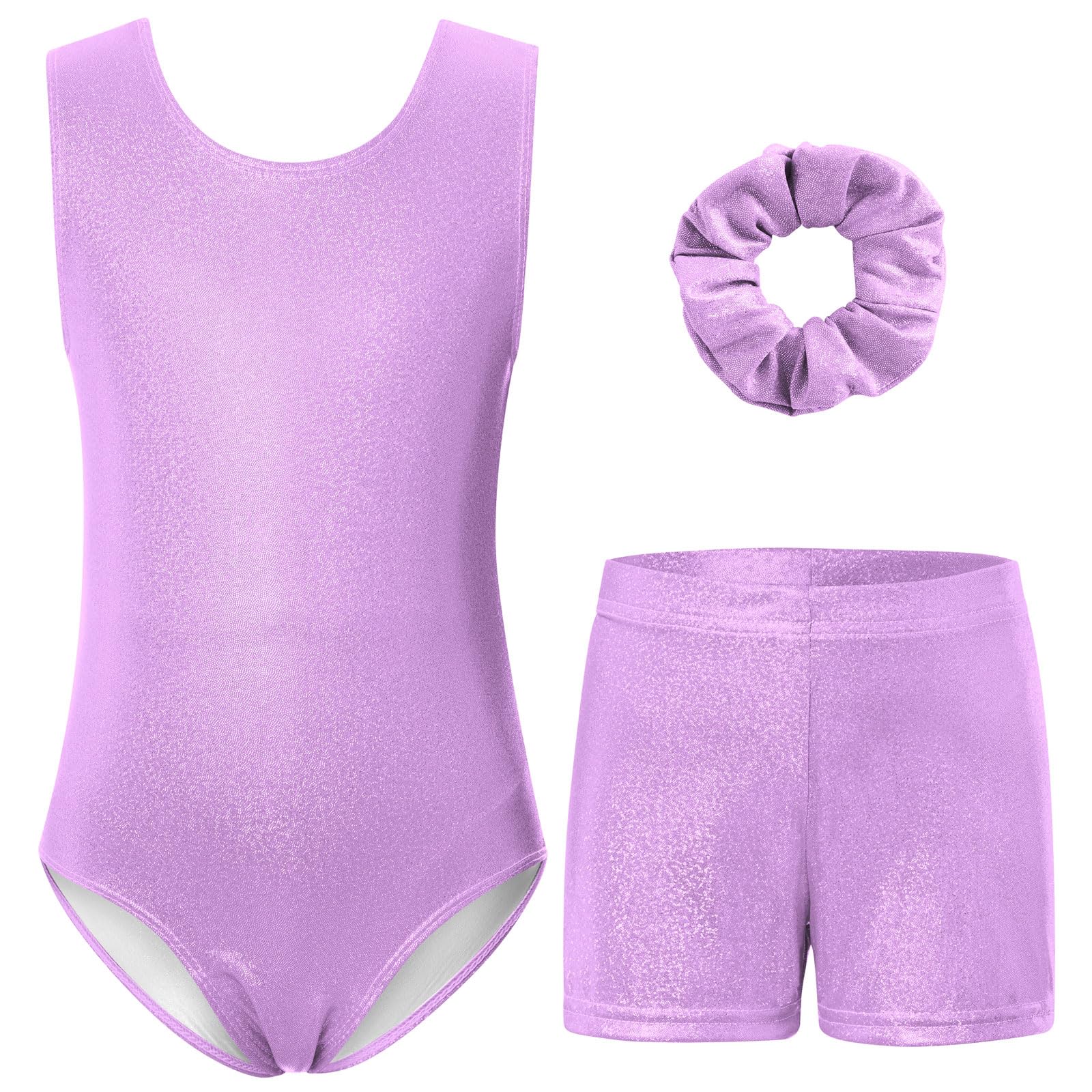 TUONROAD Purple Girls Leotards for Gymnastics Size 5 Kid Girls' Fairy 3 Piece Gym Unitards with Cover Shorts for 4t Child Shiny Diamonds Macthing Scrunchie Classic Dance Leotard Sets,4 5 Years