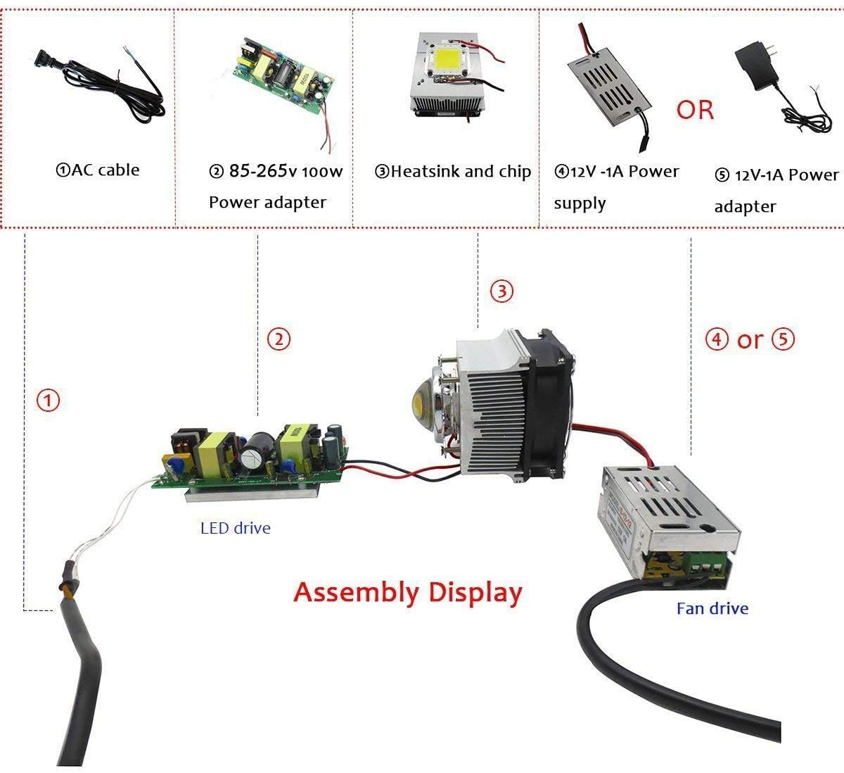 Package Include: 1pcs 20-100W LED Aluminium Heat sink with Cooling Fan 1pcs 44mm Glass Lens 1pcs 50mm Reflector cup 1pcs fixed bracekt (the other parts in the picture not include)