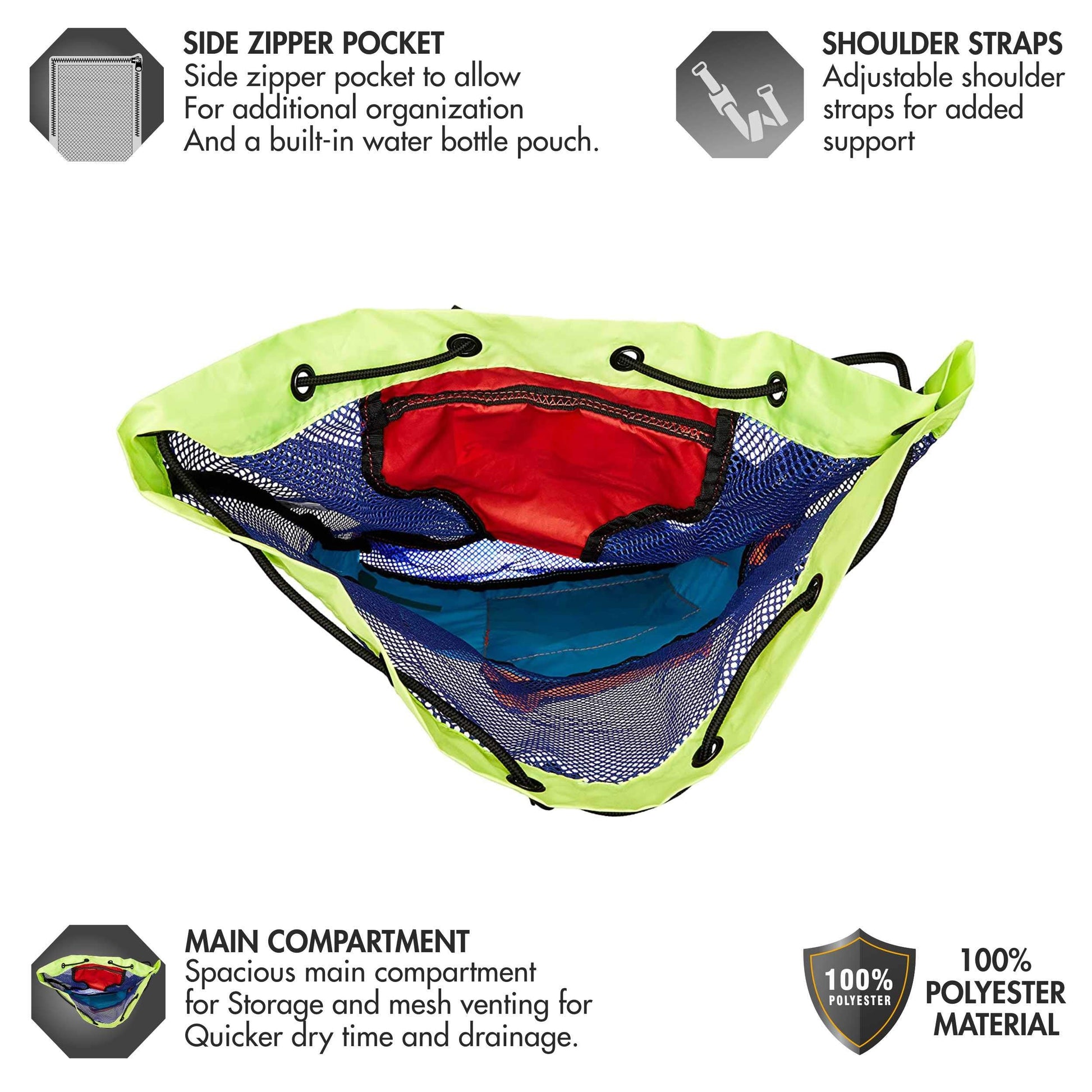QUALITY MATERIALS: Measuring 25.25 x 19 inches, the mesh backpack has a 40-liter capacity, is made from 100% durable polyester, and is available in a variety of fun colors to complement your personal style.