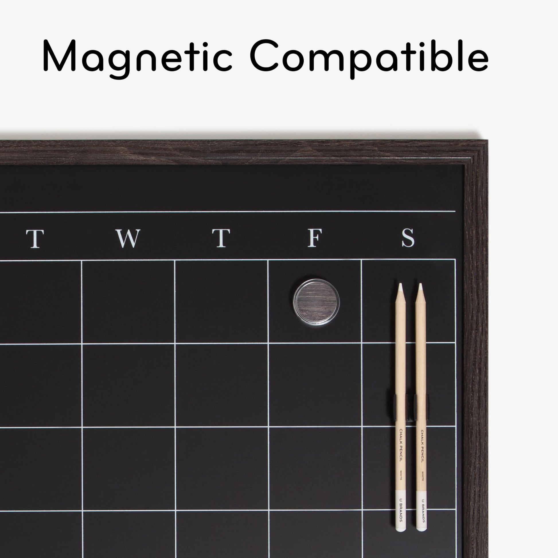 Details: Get creative, stay organized, and enhance your space with our 20'x16' Modern Magnetic Monthly Chalk Calendar Board. This board is perfect for home, office, and classroom use, featuring a stunning wood-style frame and a high-quality matte chalk surface. The magnetic writing surface also functions as a bulletin board; simply use any board magnets to pin up your notes, messages, pictures, memos, and more. Whether you prefer standard chalk or liquid chalk markers, the premium black matte chalk surface ensures smooth writing and resists ink staining and ghosting with minimal cleaning required, providing long-lasting performance. Hang this board effortlessly with our hassle-free mounting hardware and easy-to-follow instructions. For your convenience, the board comes with two white chalk pencils and two pin-it magnets. Whether it's for staying organized or creative doodling, you can't go wrong with this essential board. Explore our stylish and fashion-forward product lines, including stationery, journals, writing tools, presentation boards, and desk organization solutions for your home, school, or office.