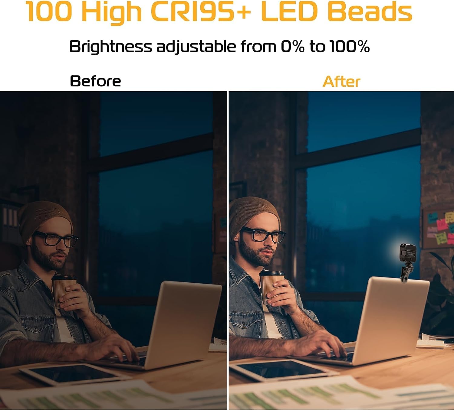 • 【100 High CRI95+ LED Beads & Soft Light Board】VL100X LED camera light with Clip has 100pcs High Quality Color Rendering Index 95+ beads and the Max Brightness up to 900Lux(2500K-6500K), lager lighting angles up to 120°. Design with soft light board, make supplement light softer and not dazzling, offer wonderful lighting. Perfect for vlogging, portrait photography, Conference/Zoom Call, Video recoarding and Live Streaming.