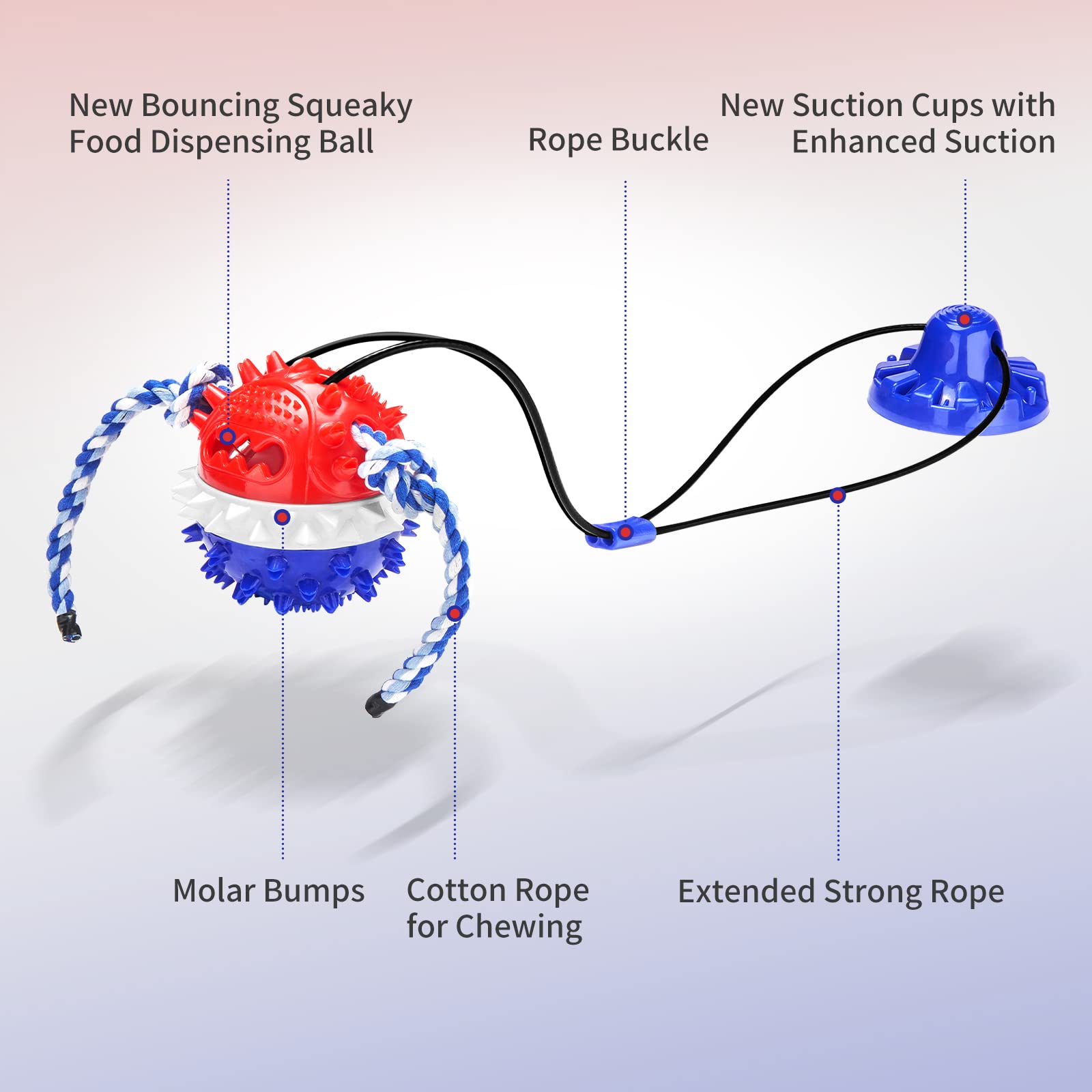 • Suction cup dog toy can work well on smooth and flat surfaces, each package contains floor sticker, you can put the floor sticker on its surface when you want to use on rough surfaces, the floor sticker will provide stronger suction for the suction cup