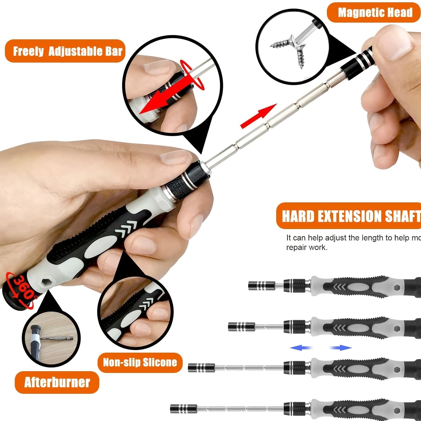 • 【Anti Slip Design Handle】The ergonomic handle of the precision screwdriver kit is comfortable to hold even for the long-time use. Equipped with a hard extension shaft and a flexible extension shaft which is easy to be extended to a tight space where the handle cannot enter.