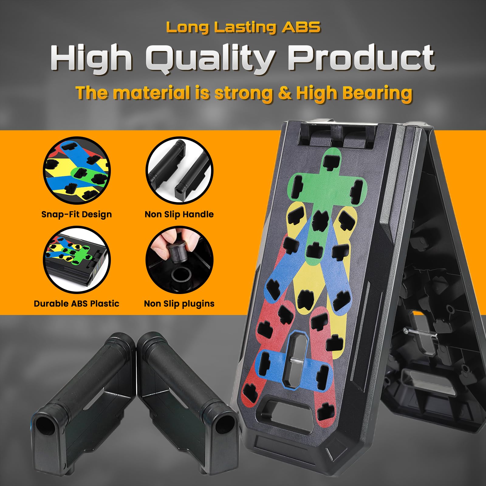 • Compact & Adaptable: All-in-one fitness system is designed to suit all users, replacing bulky gym equipment with a portable solution. It features foldable pushup bar with accessories for a comprehensive full-body workout. The adjustable push-up board handles allow targeted exercises for a more effective chest workout. This push up board for men and women is space-saving, easy to transport and convenient to use anywhere.