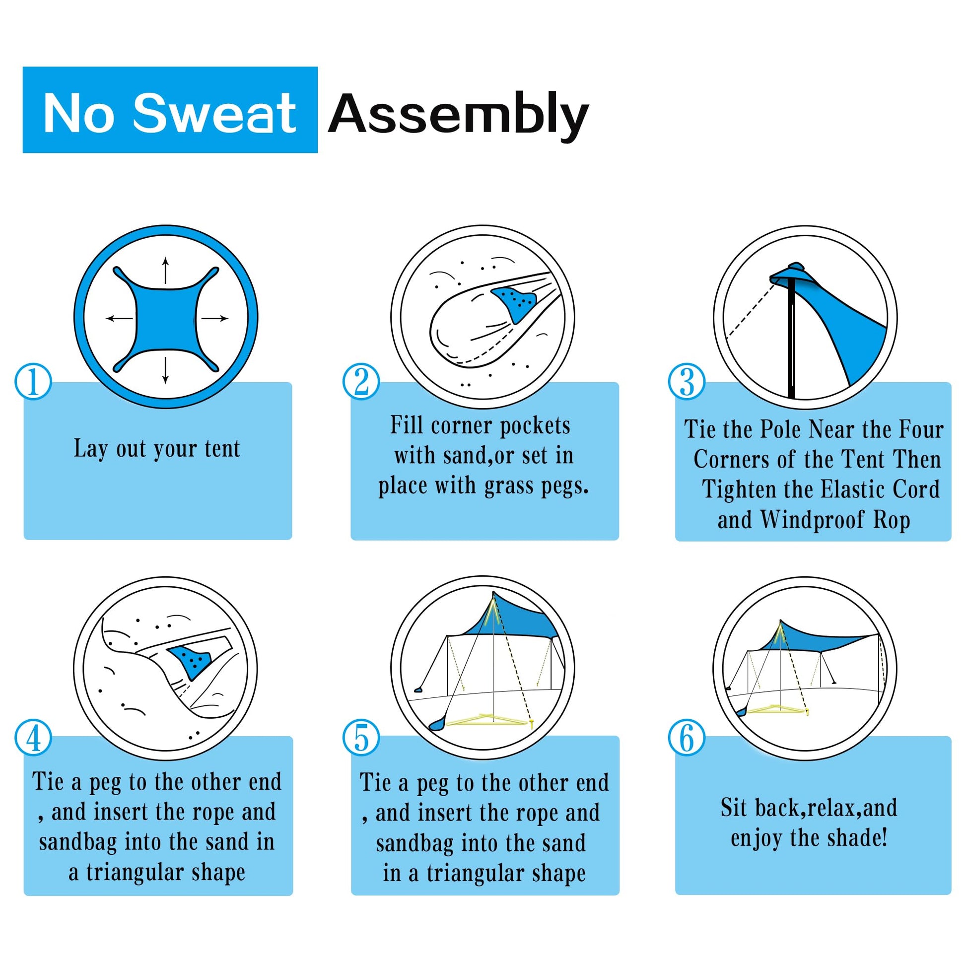 • STABILITY FEATURE:The beach shade canopy is supported by four aluminum poles (diameter 0.75 inch) and four large sandbags, along with 4 windproof ropes. They form a stable triangle that makes the tent highly wind-resistant.