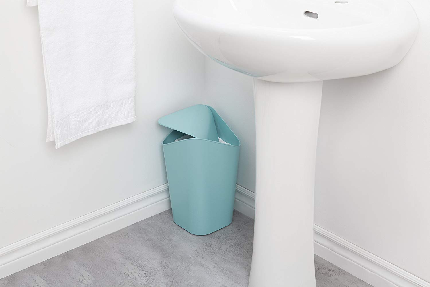 The Umbra corner can is perfect for your bedroom, bathroom or office space. The corner can perfectly match any corner in your home and is made of durable polypropylene. The swinging lid prevents odors from leaking and is hygienic. The swing's lid is removable so it is easy to swap out the debris. There is also a built-in band in the main unit, so the bag will not protrude out. The corner can has a capacity of 5 liters, and is sized at 7.9 x 8.3 x 11.4 inches (200 x 210 x 290 mm), and comes in a variety of colors. The corner can was designed by Alan Wisniewski for Umbra.