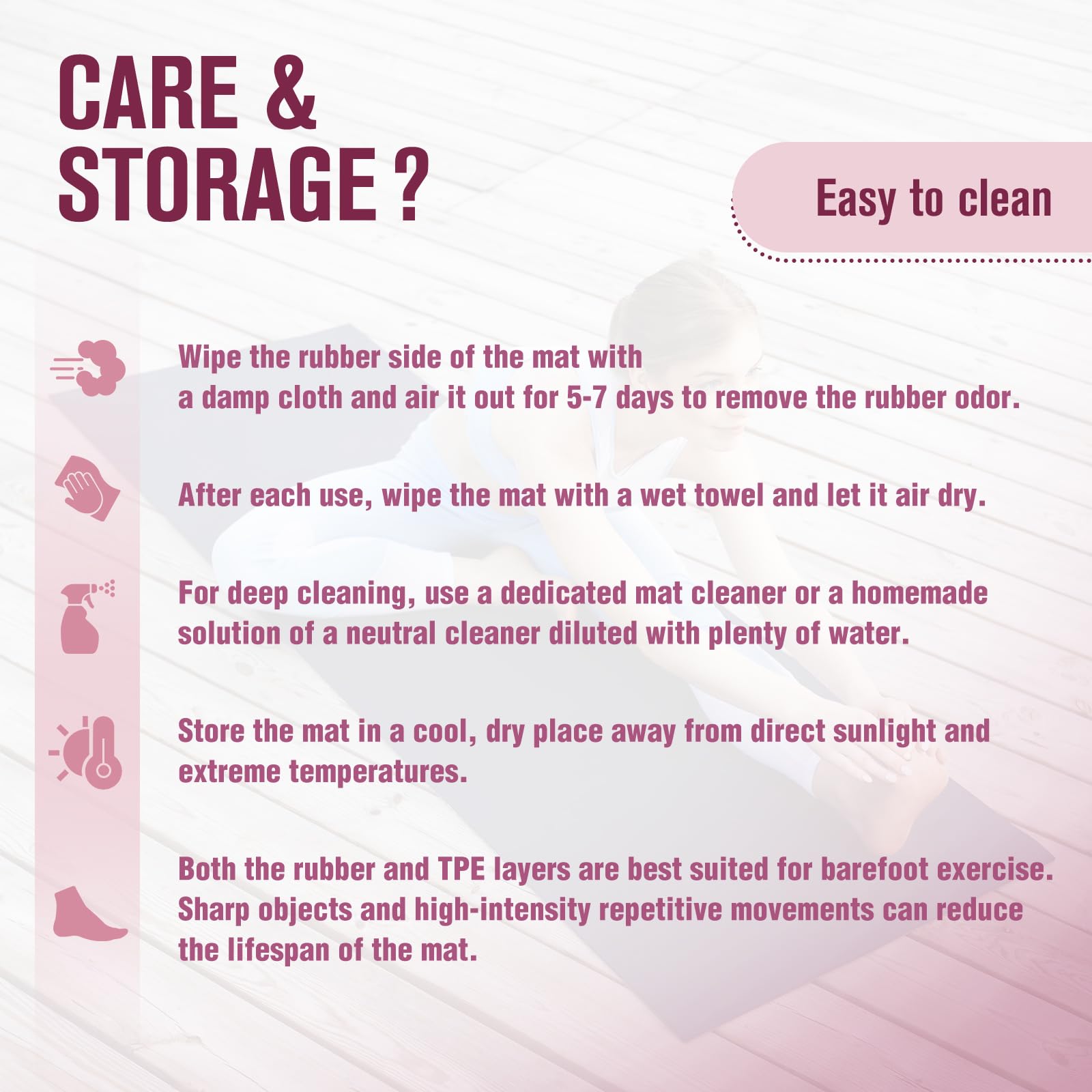 • CARE INSTRUCTION - 1. All natural rubber possesses a harmless rubber aroma. Wipe the rubber side with a damp cloth and place it in a well-ventilated area for 5-7 days, allowing the scent to gradually fade. 2. Store the yoga mat in a cool, dry place away from direct sunlight and extreme temperatures.