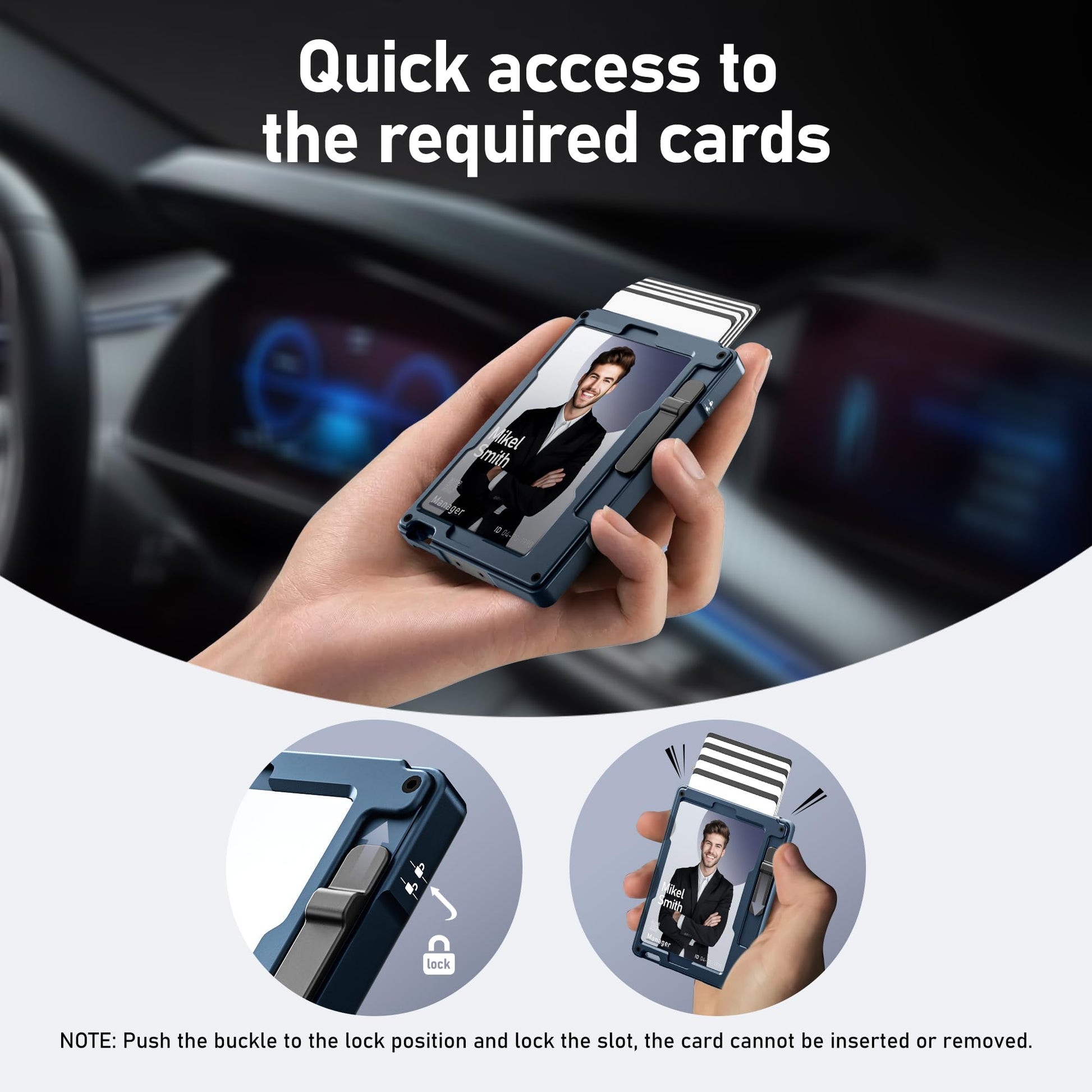 • [Secure Men Wallet with Locking Clasp] This minimalist smart wallet card holder has a slide in and pop out function. Not only built-in silicone strips, but also with a locking clasp design to lock the cards more securely, just push it upward and hear the ‘da’ sound, the cards are locked. When in use, simply press down and hear a ‘click’ to eject the card for everyday use.