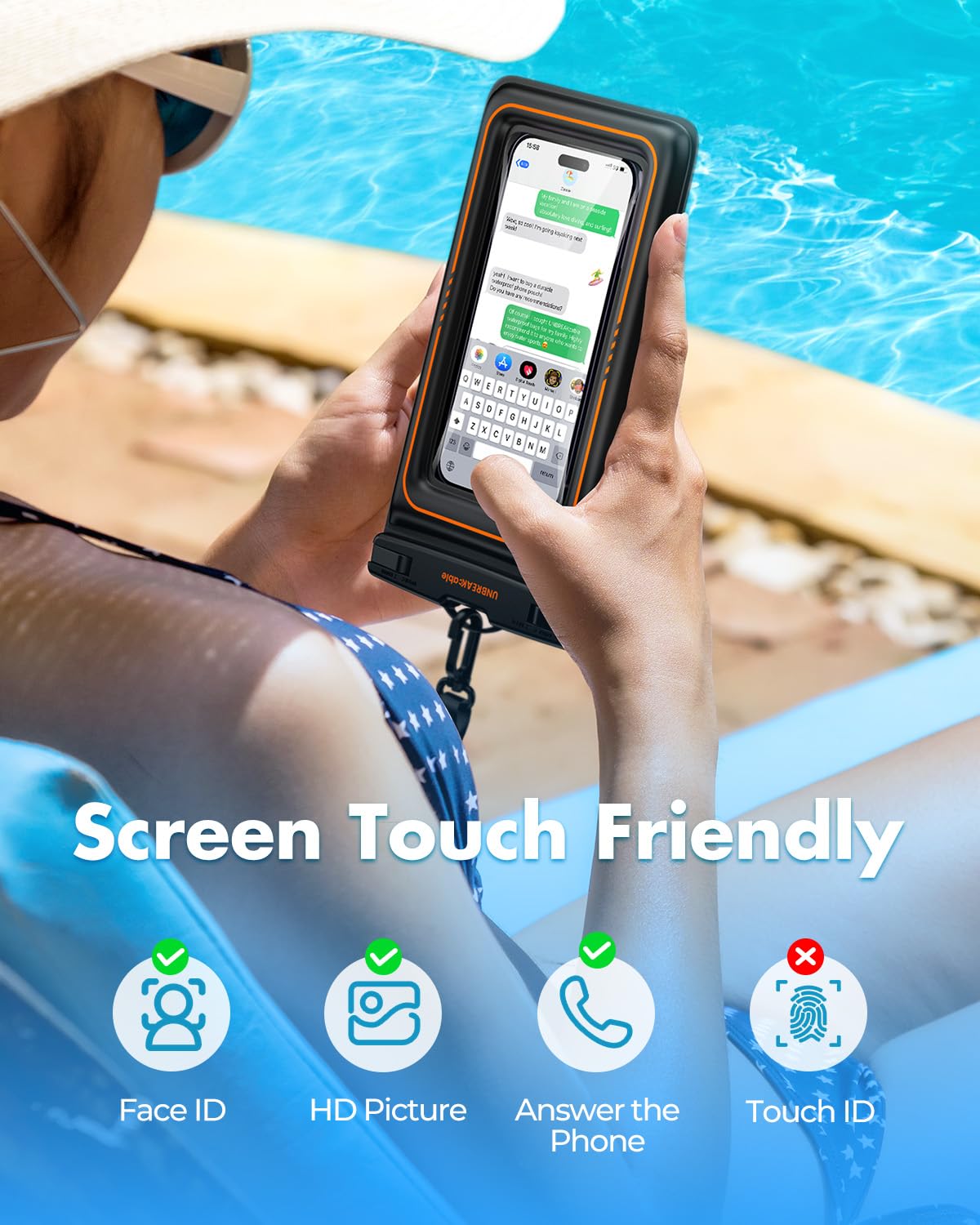 • Sensitive Touch: The waterproof phone case is crafted from premium PVC material, ensuring that the touchscreen functions smoothly through the clear window. This allows you to browse videos, send texts, and use face unlock features without needing to remove your phone from the pouch. (Note: Touch ID fingerprints are not supported).